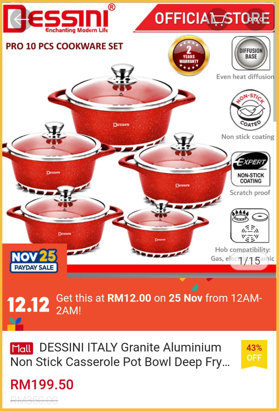 ▪ DESSINI ITALY Granite Aluminium Non Stick Casserole Pot Bowl Deep Fry Pan Cookware Tool (10 Pcs) – RM350 RM12