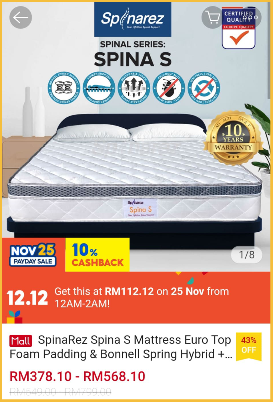 ▪SpinaRez Spina S Tilam Mattress Euro Top Foam Padding & Bonnell Spring Hybrid + Coconut Fiber (10″) Queen – RM699 RM112.12