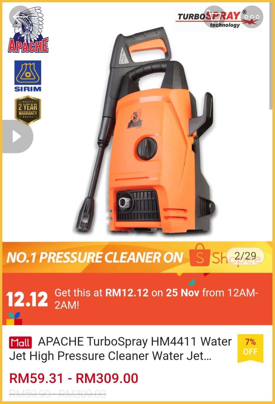 ▪ APACHE TurboSpray HM4411 Water Jet High Pressure Cleaner Water Jet Sprayer Machine – RM229 RM12.12