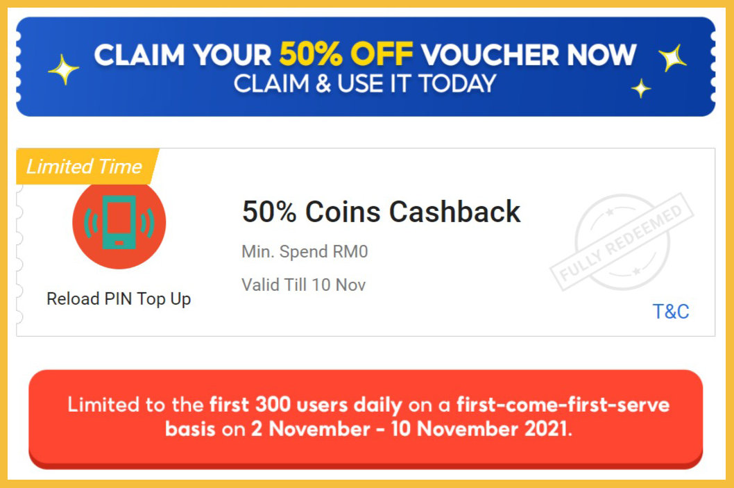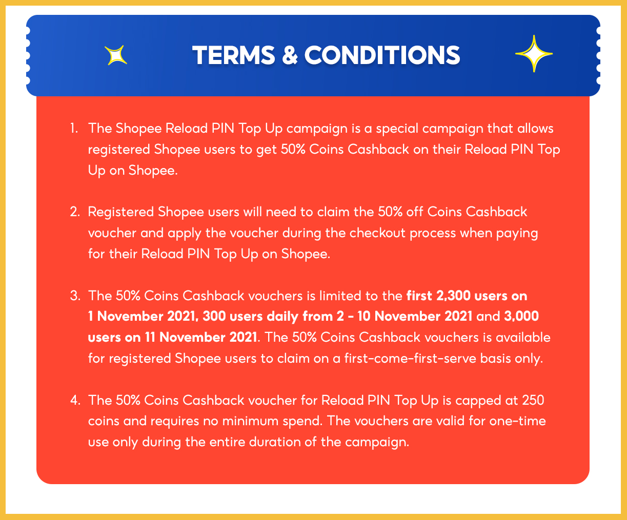 促销活动:在Shopee 充值手机卡,可获得50%Coins 回扣(高达250Coins)