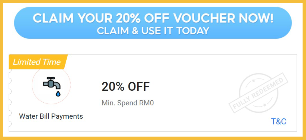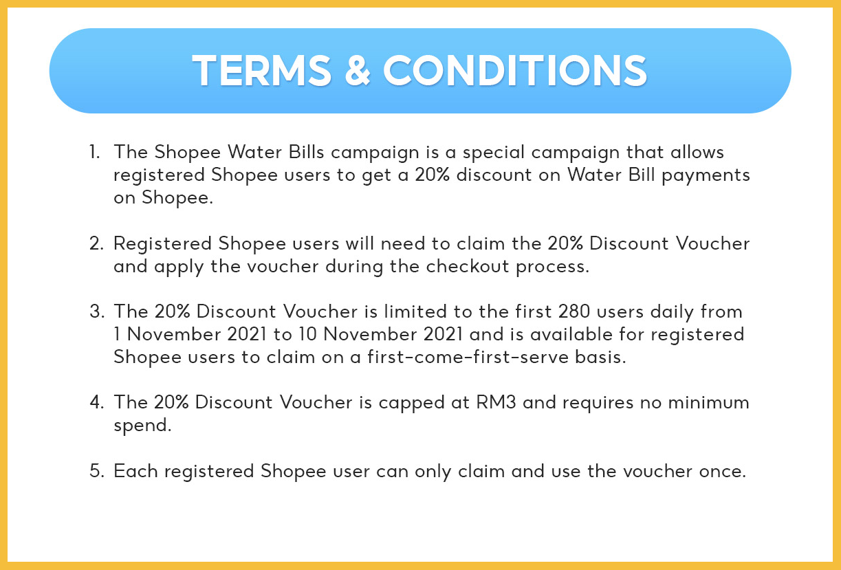 促销活动:在Shopee 缴付水费账单,可享有20%折扣优惠(高达RM3)
