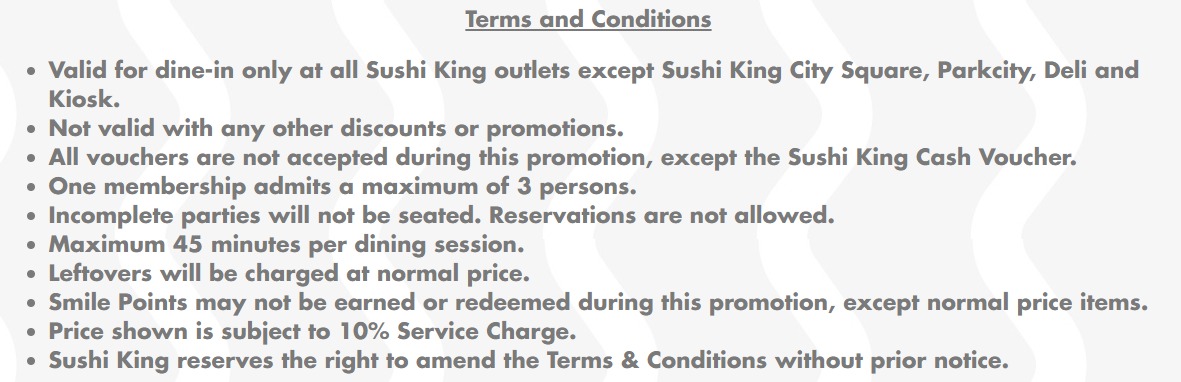 - 在优惠不接受任何折扣券,除了Sushi King Cash Voucher