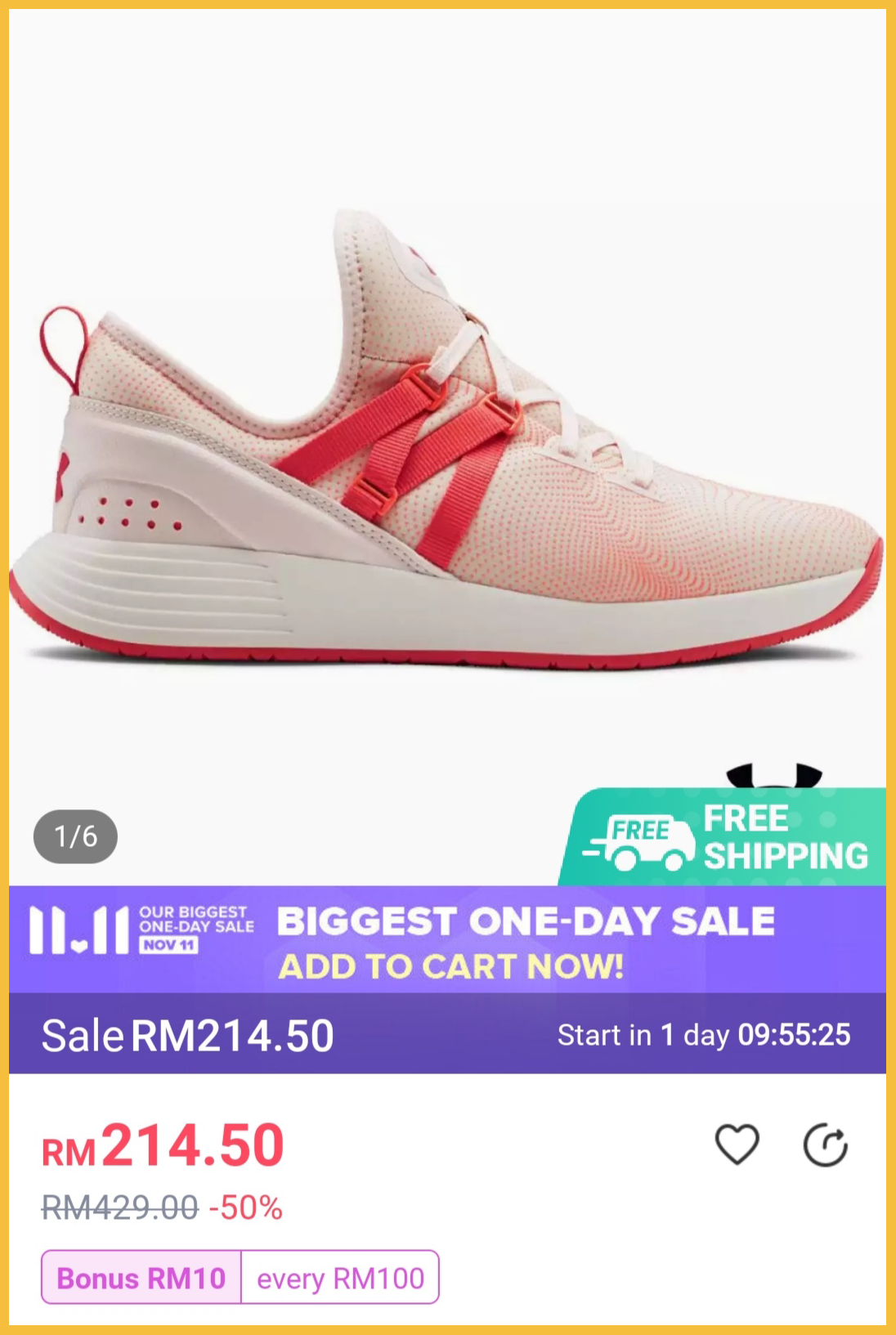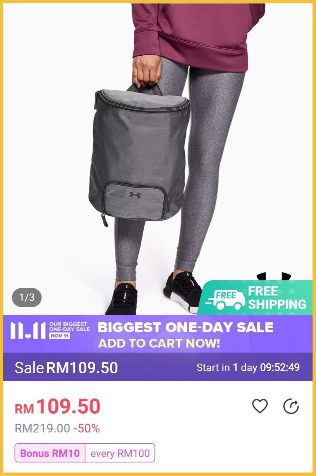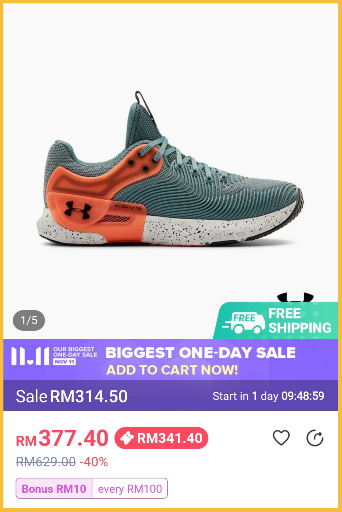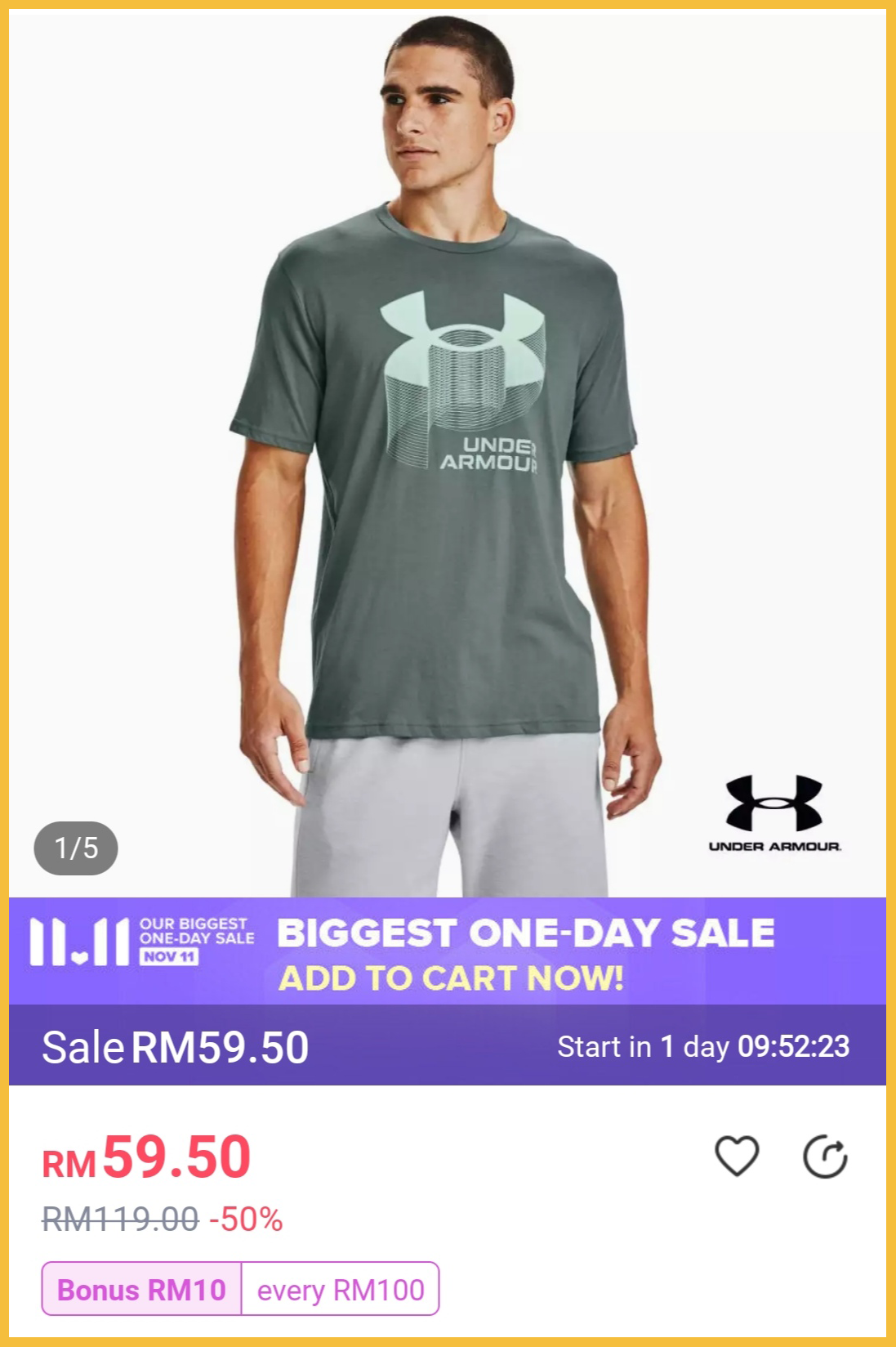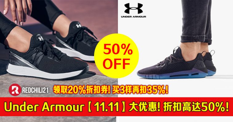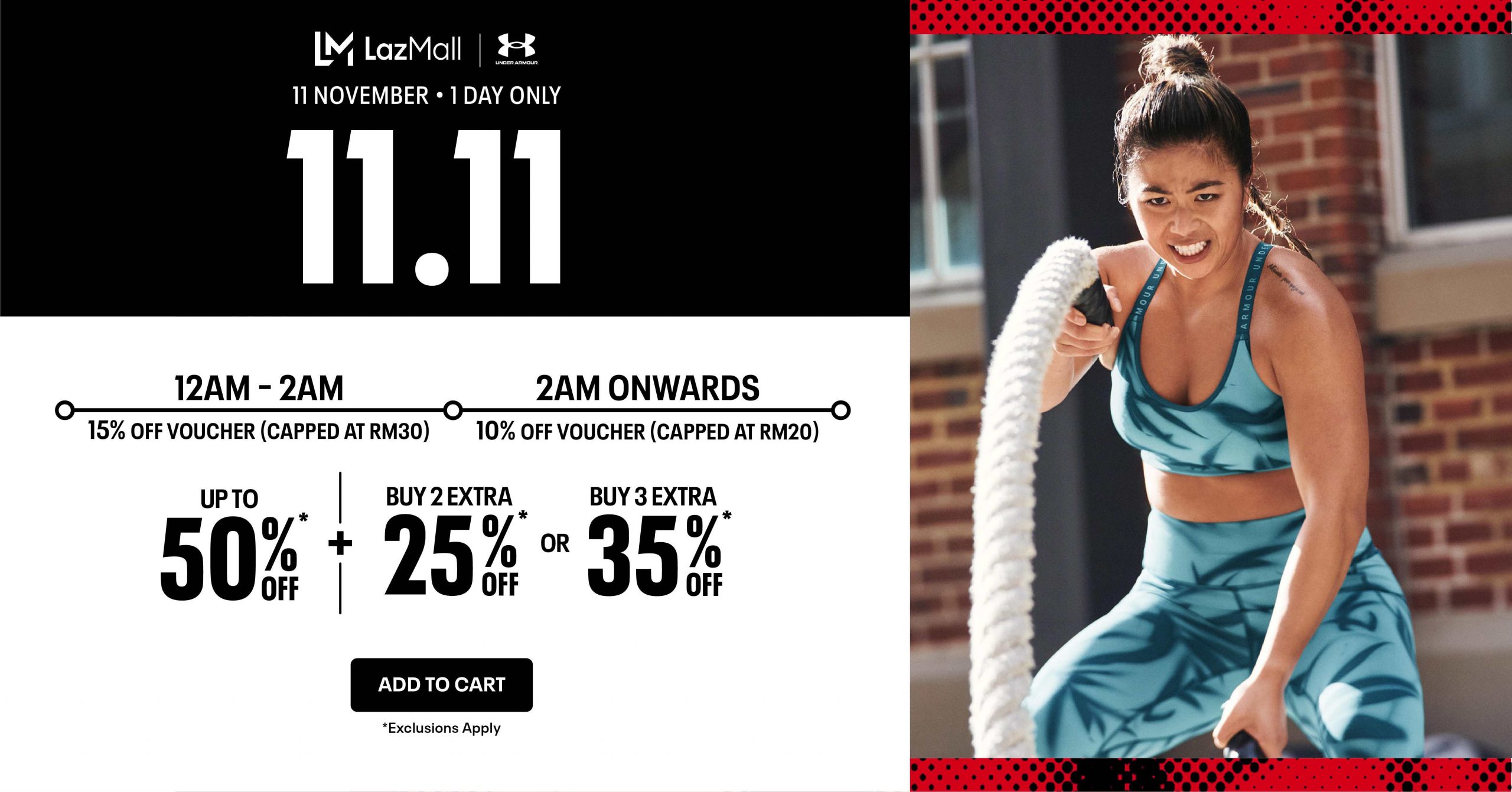 这项优惠是由Under Armour 与Lazada 联合推出【11.11】大优惠,运动商品享有高达50%折扣!购买2样额外折扣25%,购买3样商品折扣35%!