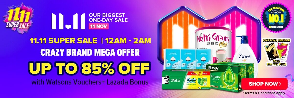为了欢庆盛大11.11 购物节,大马Watsons 官方推出大促销!商品折扣高达85%,以及领取高达RM66 折扣券!