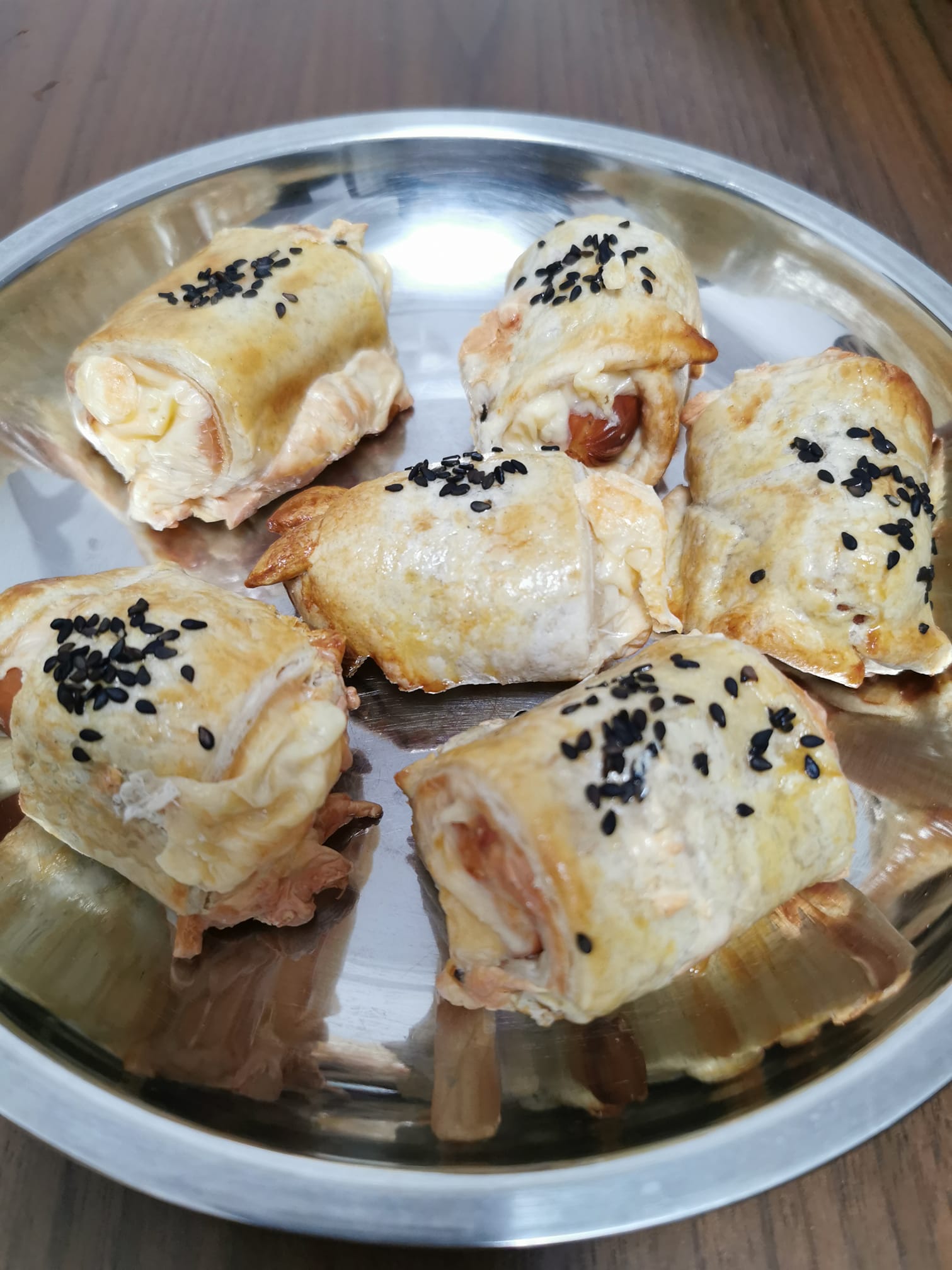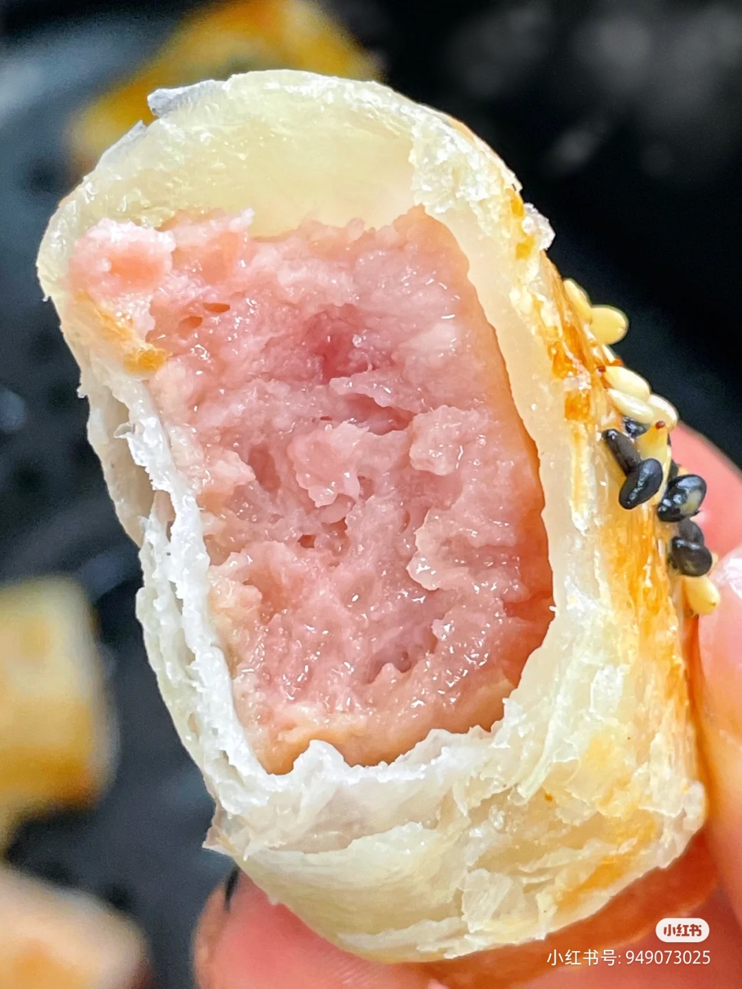 步骤1:午餐肉切小块,手抓饼切成小长方形,卷起来,刷上全蛋液,撒点芝麻装饰!