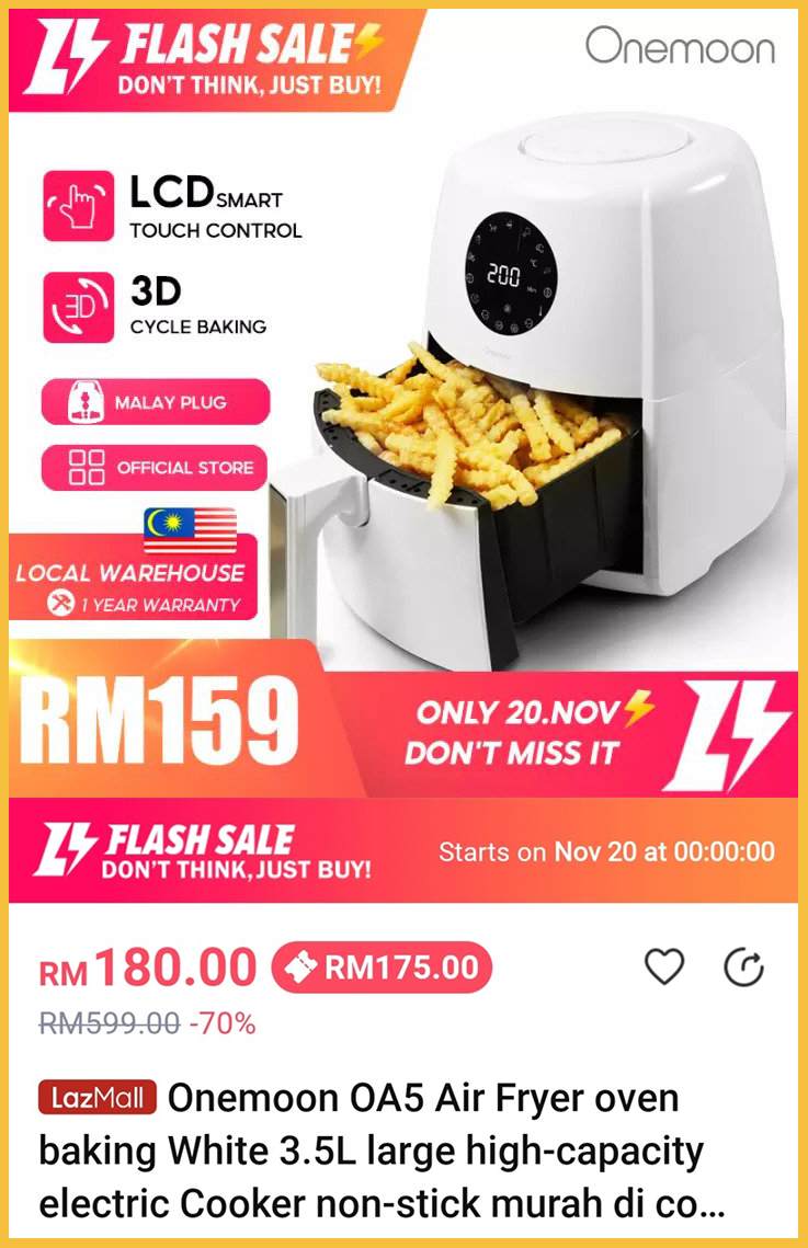 ① Onemoon OA5 Large High-Capacity Air Fryer (3.5L) – 售价RM159(11月20日限时优惠)
