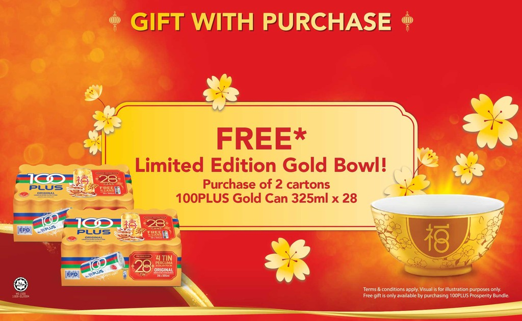 ① 购买2箱 (24 + 4罐装) 100Plus 免费送出精美金饭碗