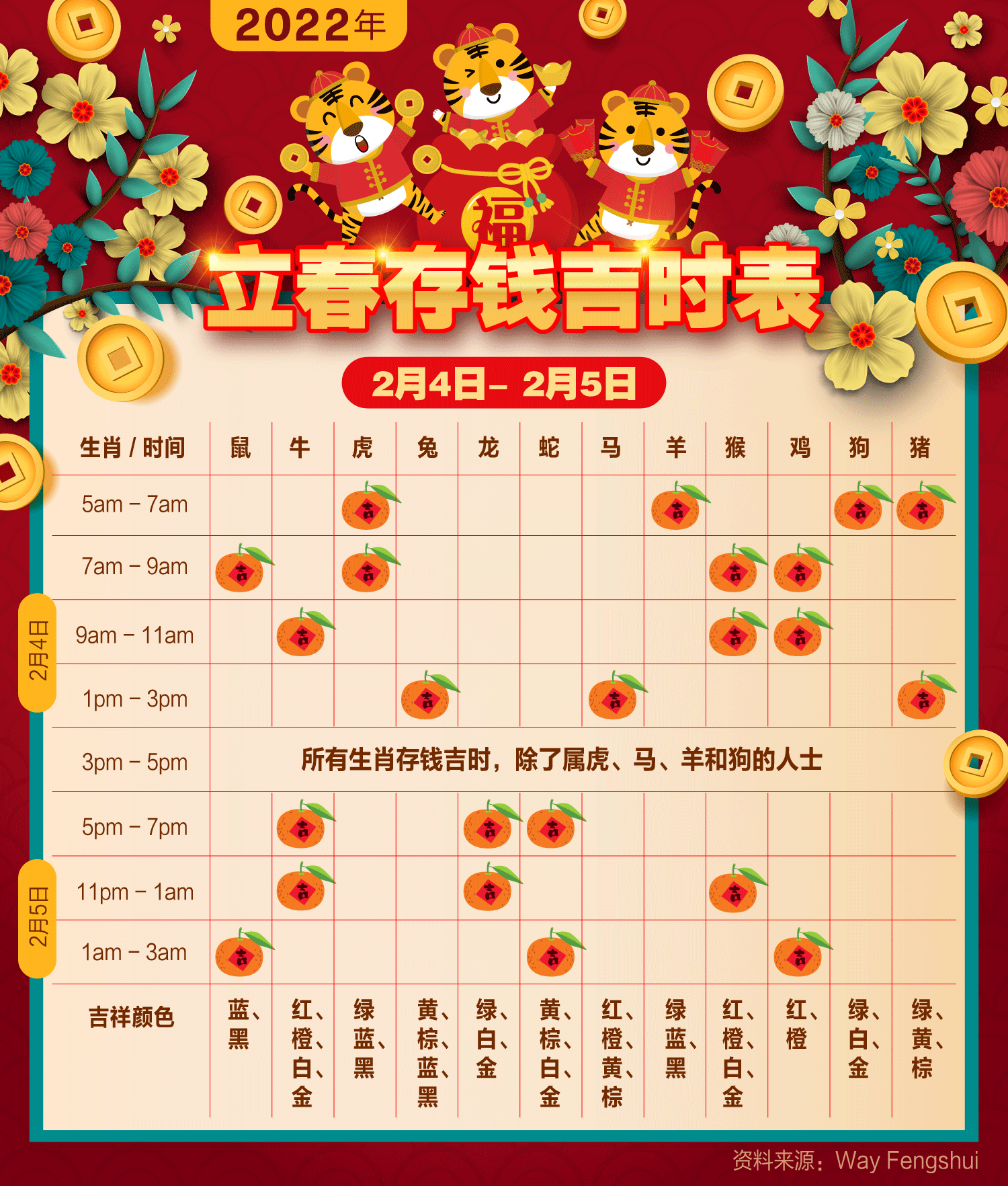 根据正道风水(Way Fengshui)所整理出来的2022立春存钱吉时表!(立春存钱日期2月4日 – 2月5日)!