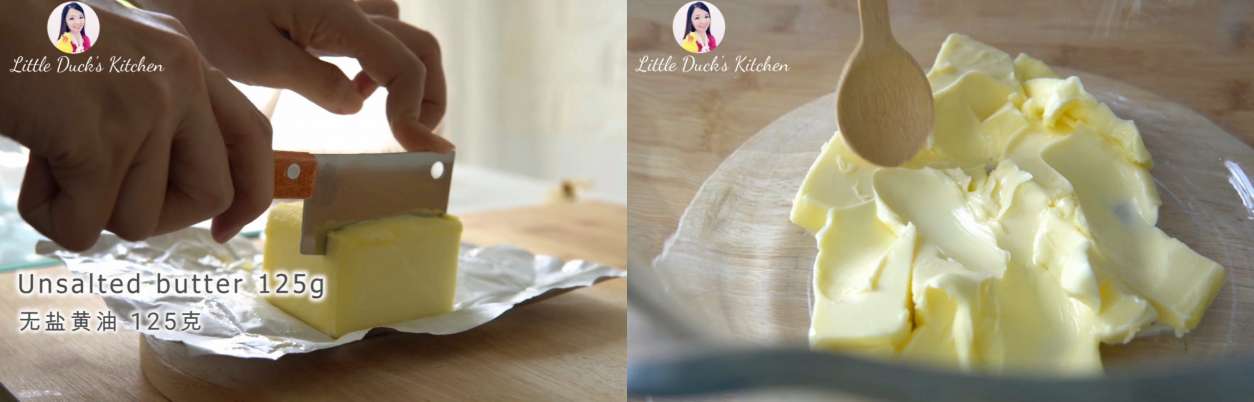 1. 准备125g 的无盐黄油,把黄油装在容器内后等待软化,并使用汤匙按压黄油.