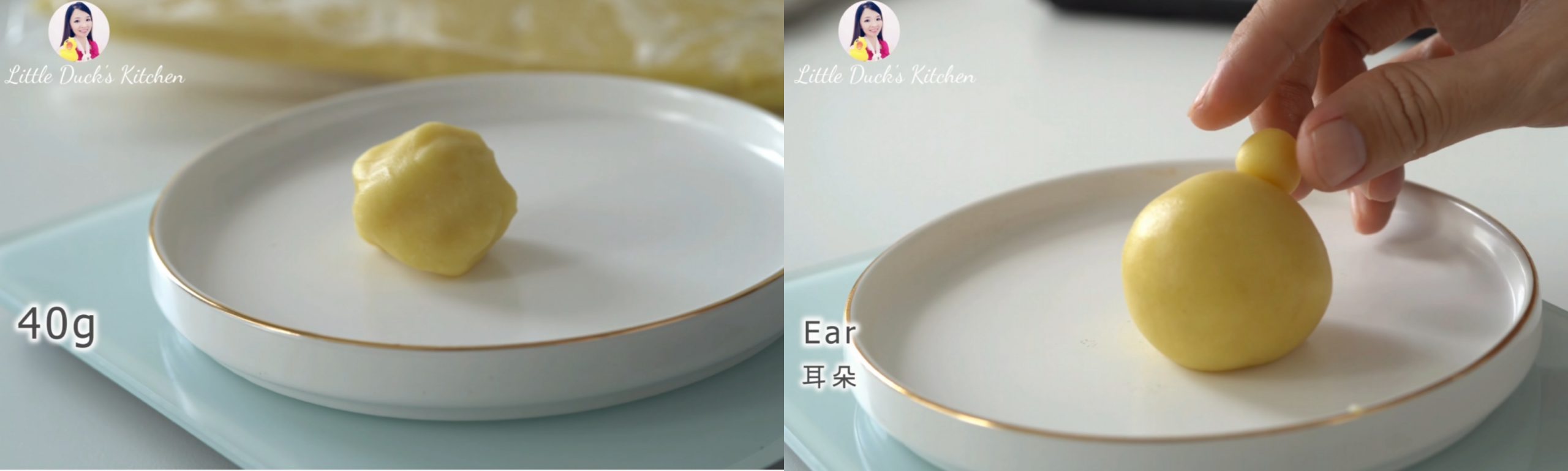 10. 这时准备不占烘培纸铺在烤盘上。取出冷冻后的面团,把40g 面团搓成圆形。再搓2个小圆形,做成老虎耳朵。