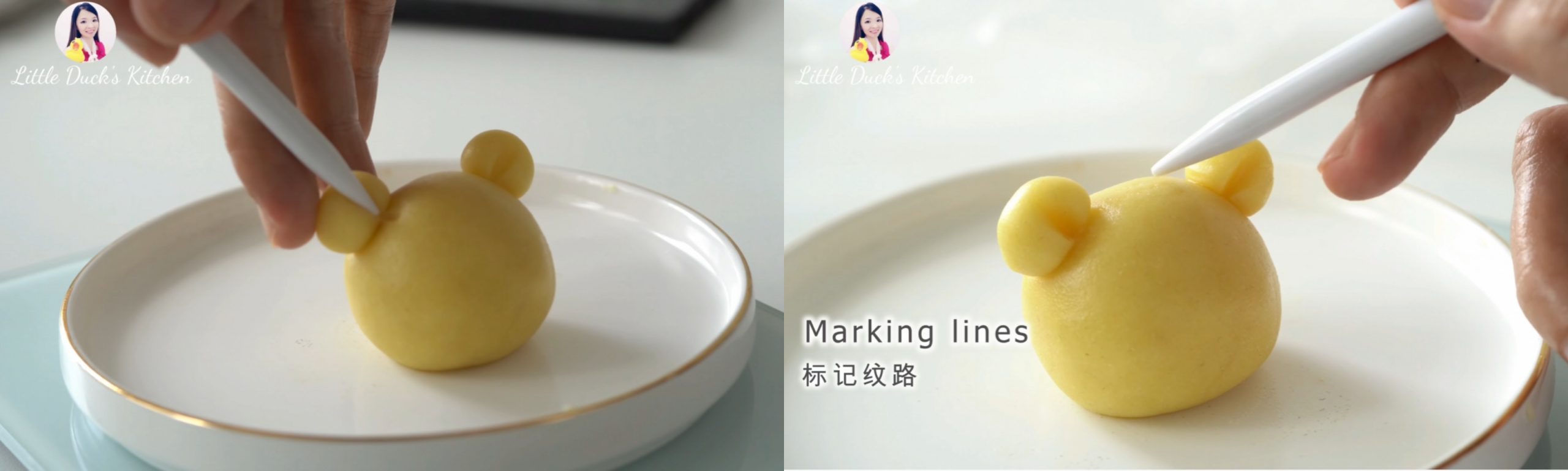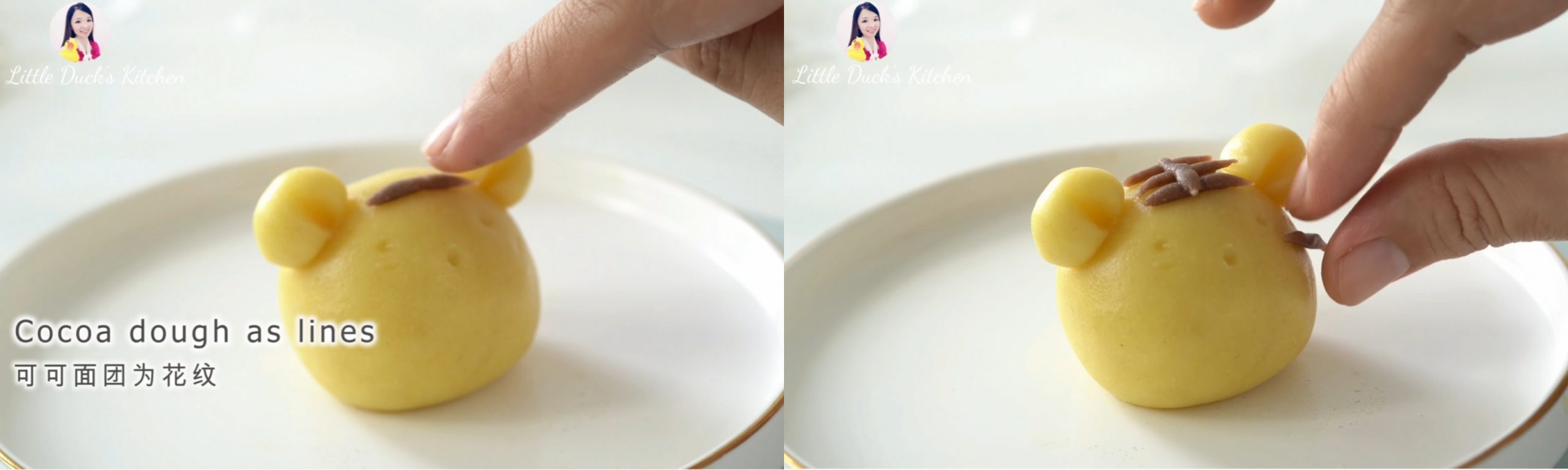12. 取出一点可可面团,搓成条状,粘在老虎耳朵之间,做成老虎花纹。