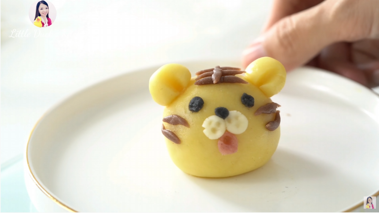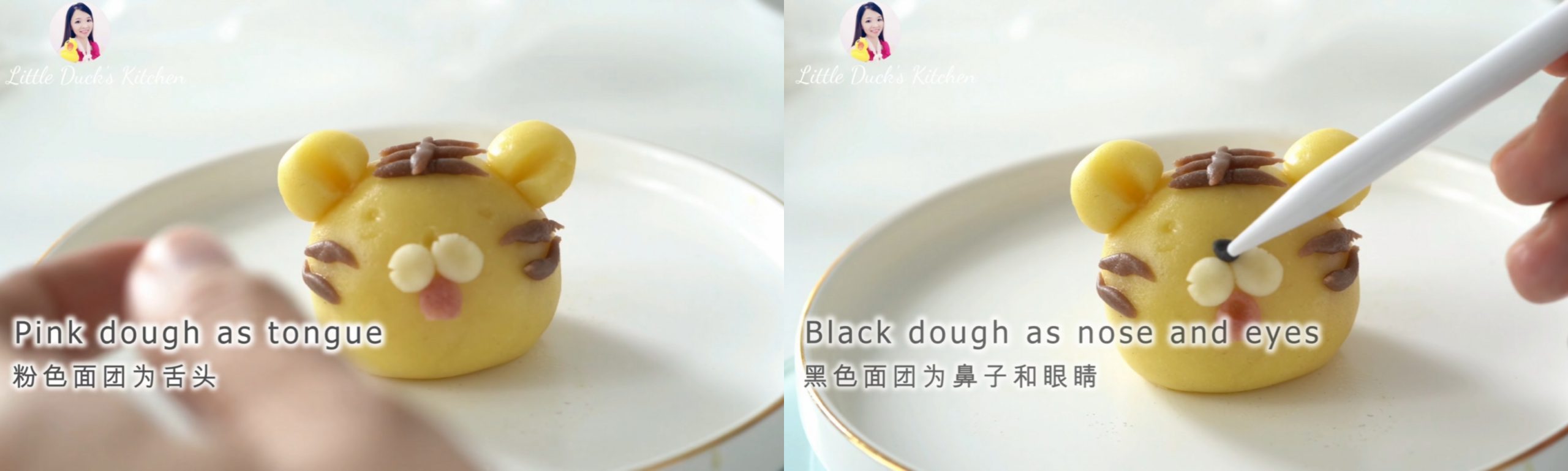13. 过后,取出原味团搓成小圆形,贴在老虎脸部中央(鼻子)。用黑色面团为老虎鼻子和眼睛。
