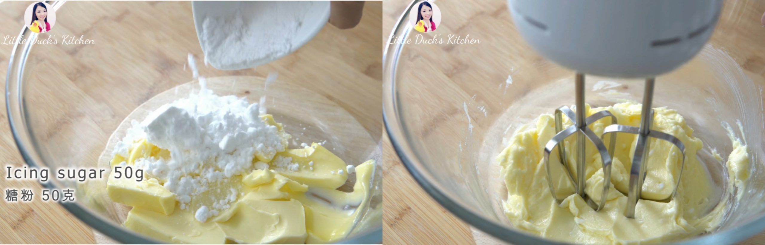 2.加入50g糖粉、混合均匀后使用搅拌器,以中速度搅拌。打发至顺滑。