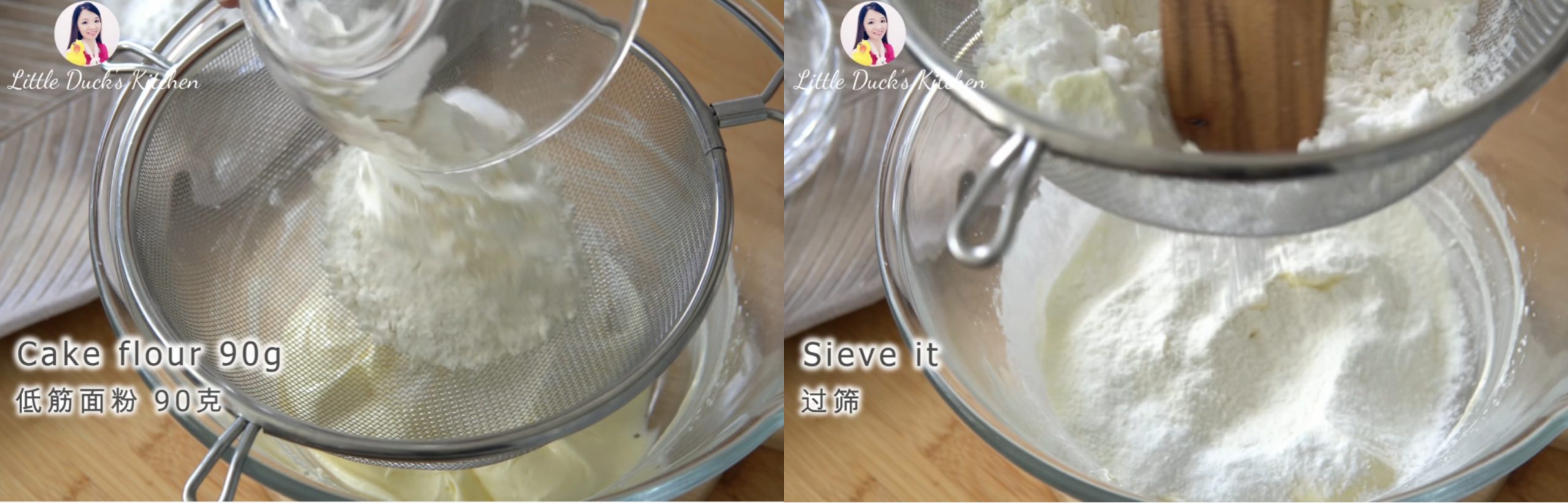 4.继续筛入低筋面粉、玉米淀粉、熟蛋黄。