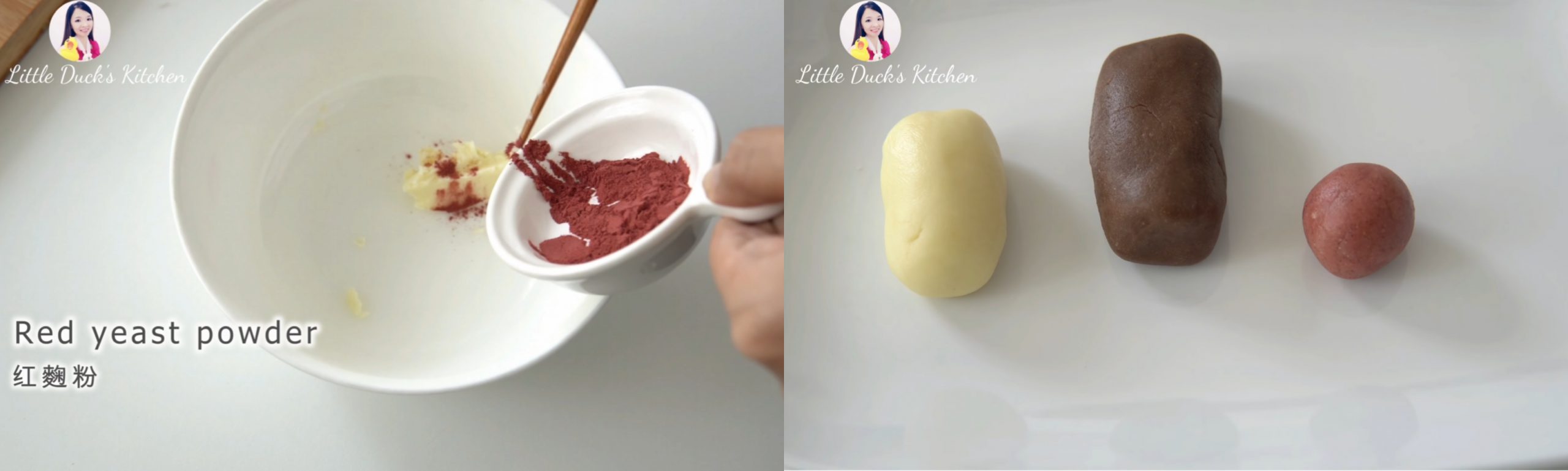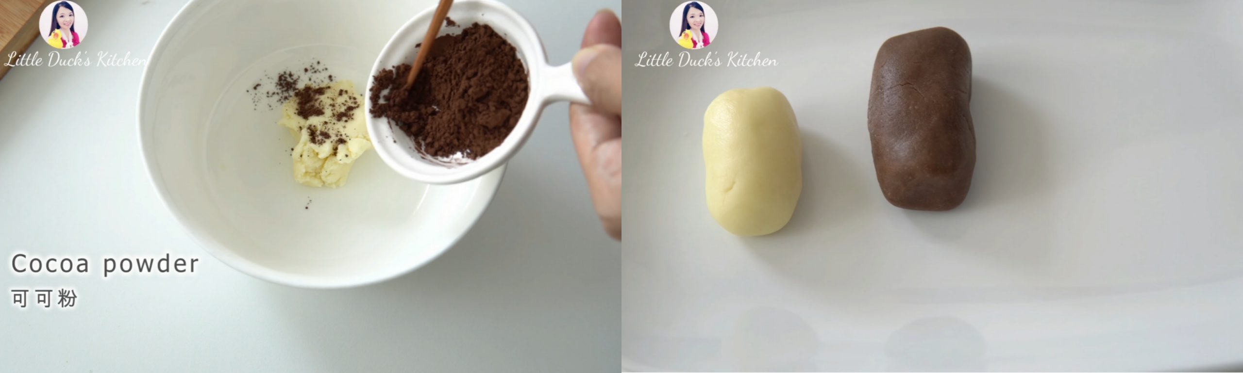 ※ 注意:分成2份,一份较多,一份较少(比较多的放入少量可可粉揉成浅,比较少的多放点可可粉揉成深色)。