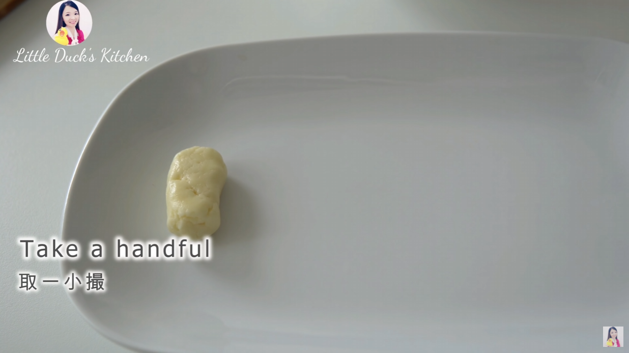 6.浅色面团分成8份,每个约15g,揉成圆形,再用大拇指压扁。