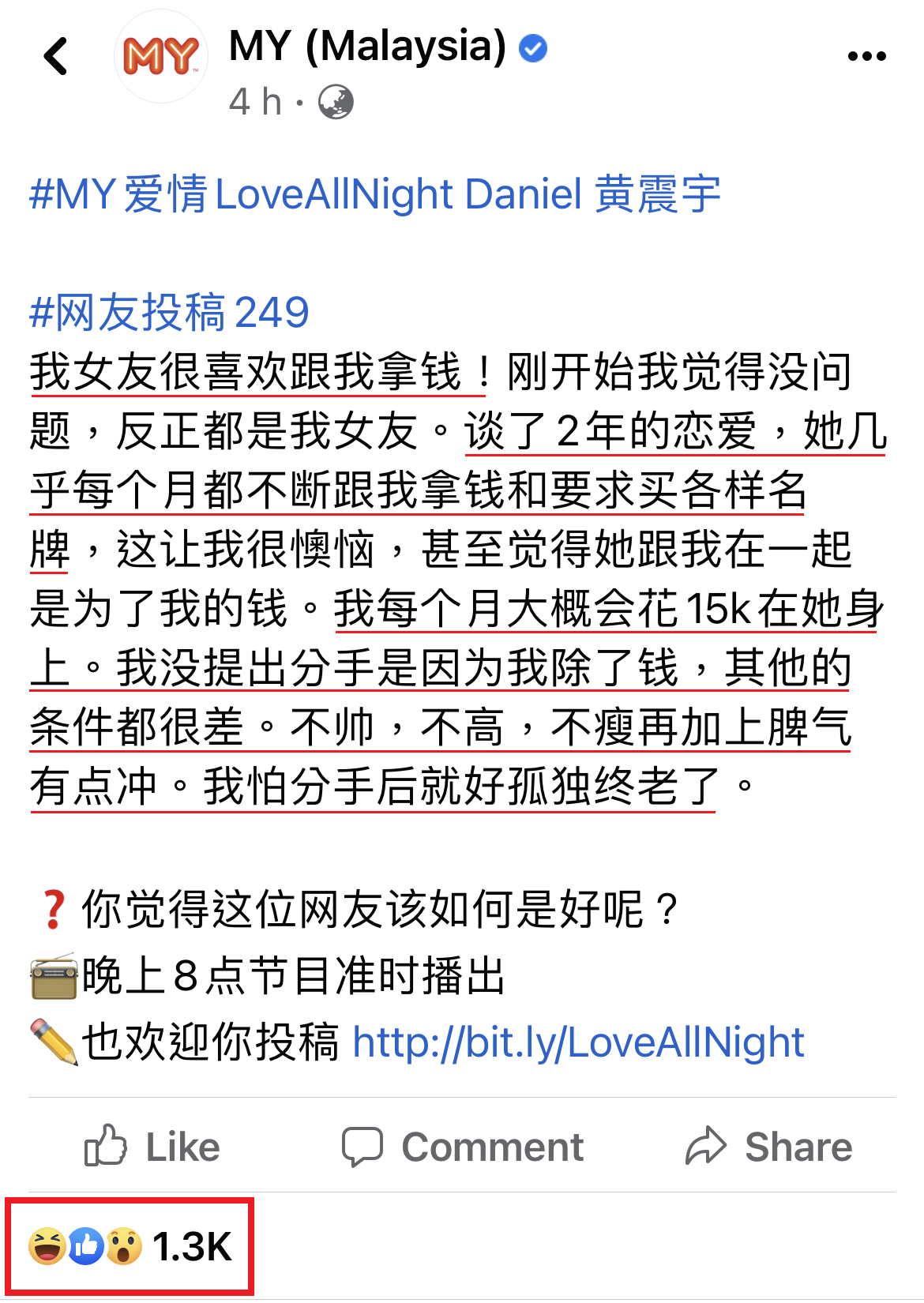 一名大马男子日前在 MY FM 匿名投稿,指在女友身上的花费过于庞大,让他感觉女友是为了钱才跟他在一起的,但他觉得自己除了经济方面其他条件都不好,所以迟迟不敢提分手。