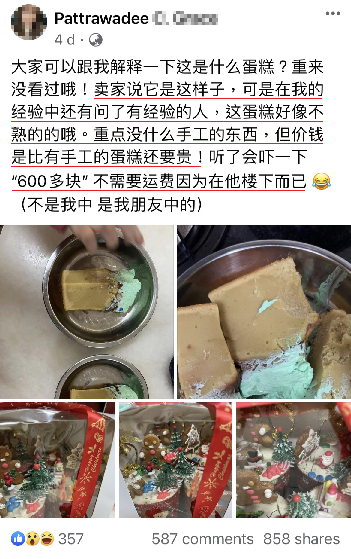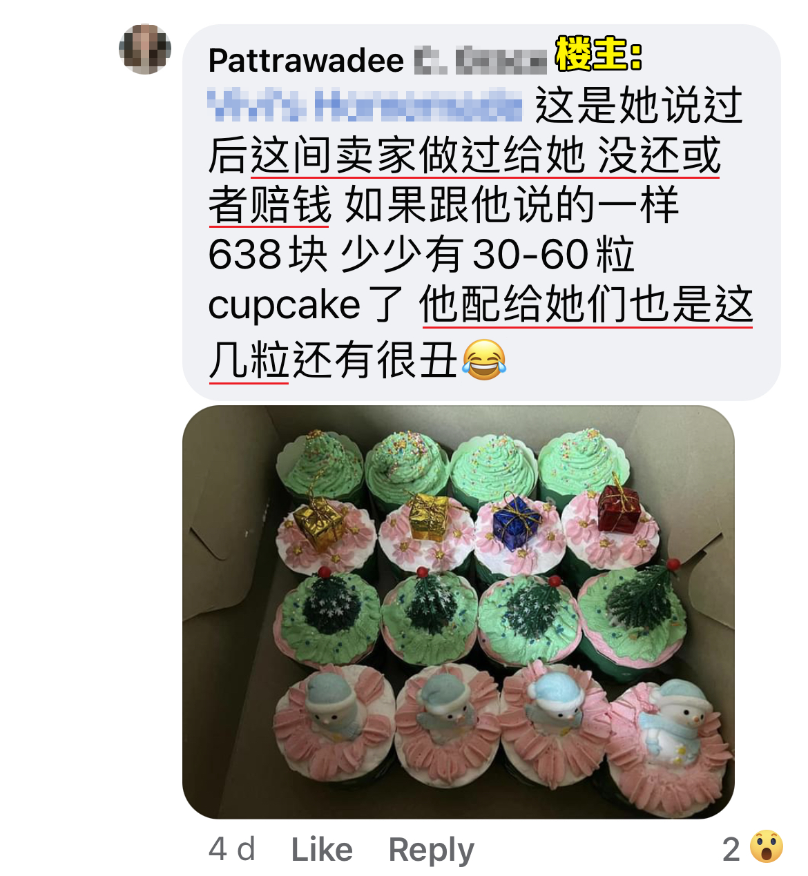 近日一名大马网友在脸书PO文分享朋友的经历,花了RM638订制圣诞系列的纸杯蛋糕结果“严重翻车”!