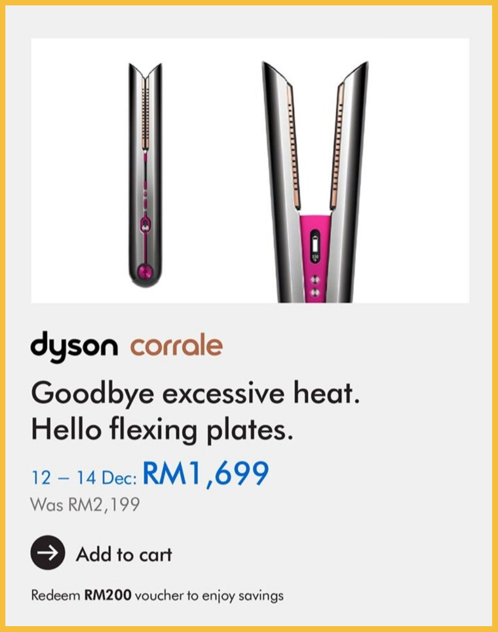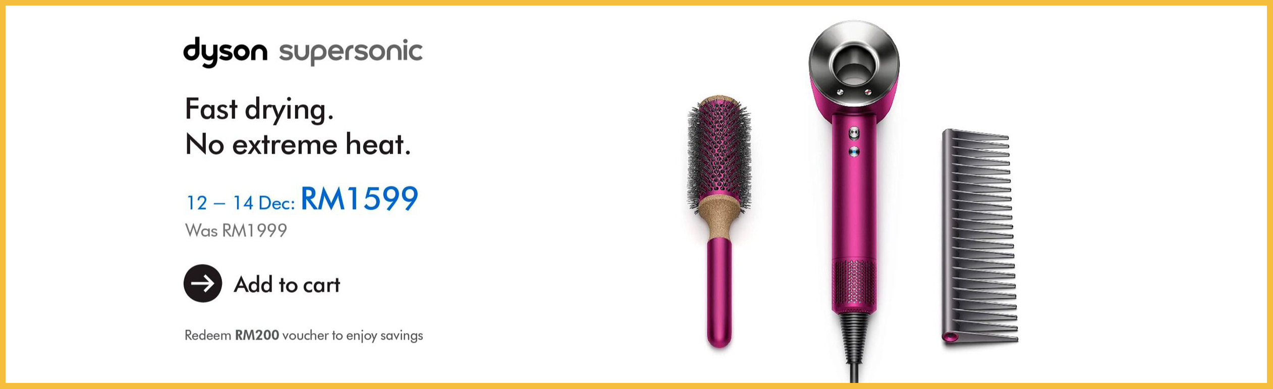 ▼ 像是Dyson Supersonic 吹风机,在12月12日这天购买只需RM1599(原价RM1999;包含梳子和刷子),整整帮你省下RM400!