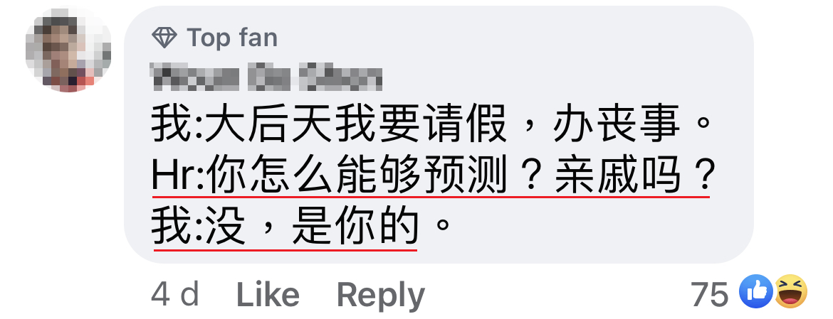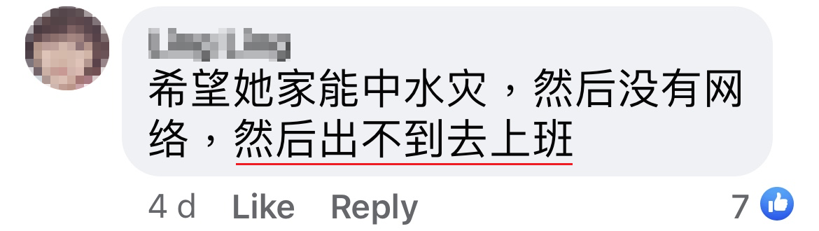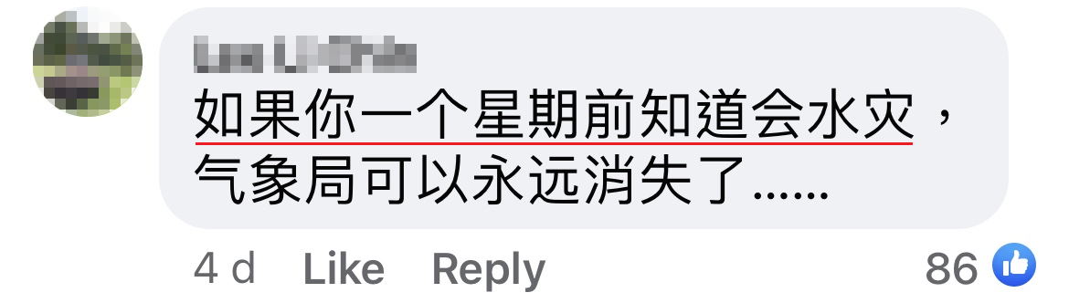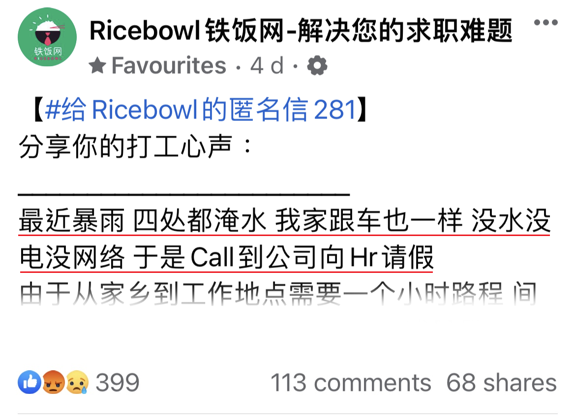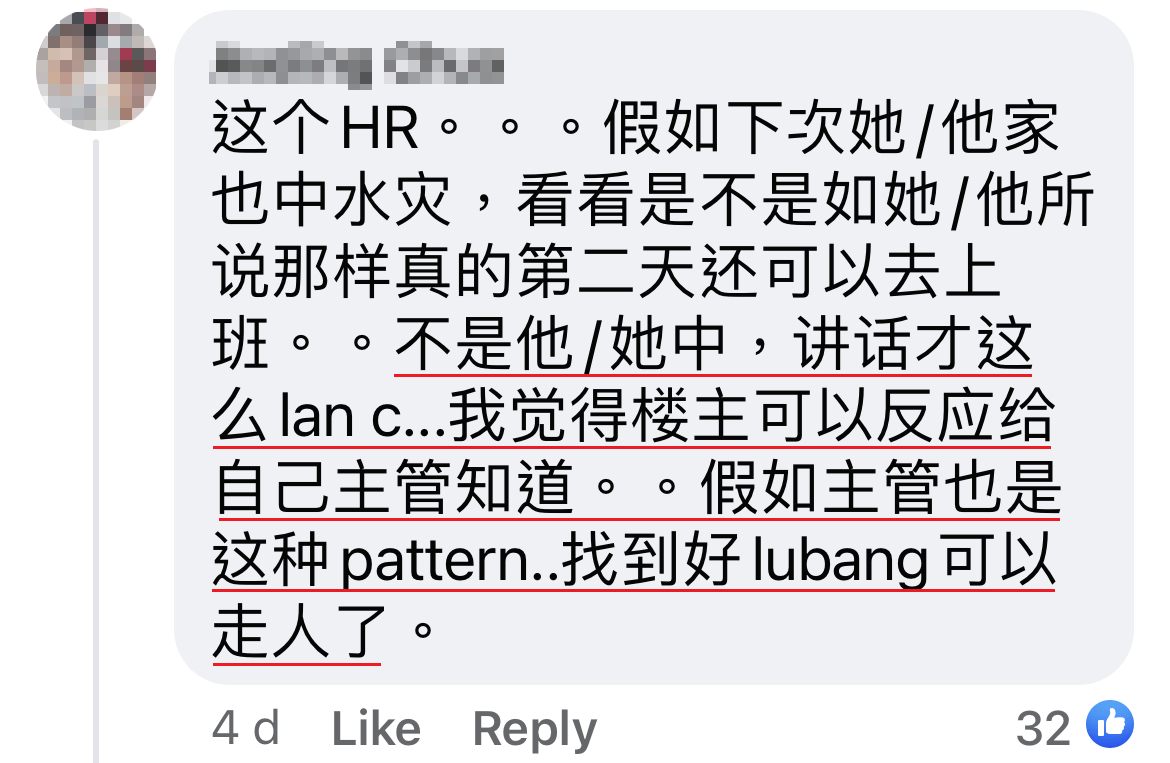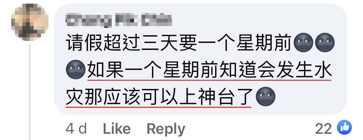 我:我会暂时请假三天,可能会延长,因为家里淹水,家、车都遭殃,路也已经封锁。