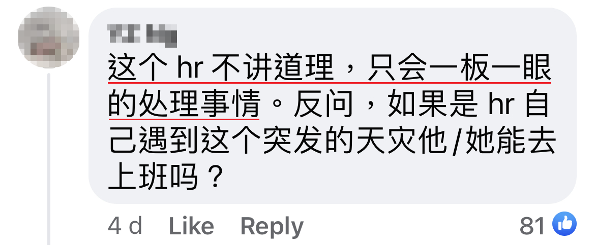 近日一位打工人匿名PO文,因为家里淹水而且去公司的路段被封了,所以需要向公司请假,结果公司人事部(HR)的答复让人如此心寒…