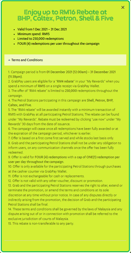 这项优惠是由Grab 与5家油站公司联合推出添油优惠!添油最少RM15 ,就可获得RM4 现金回扣!需要注意的是,必须使用GrabPay 电子钱包付款!