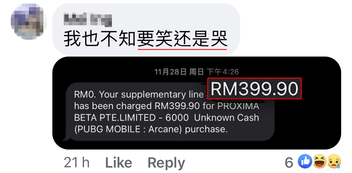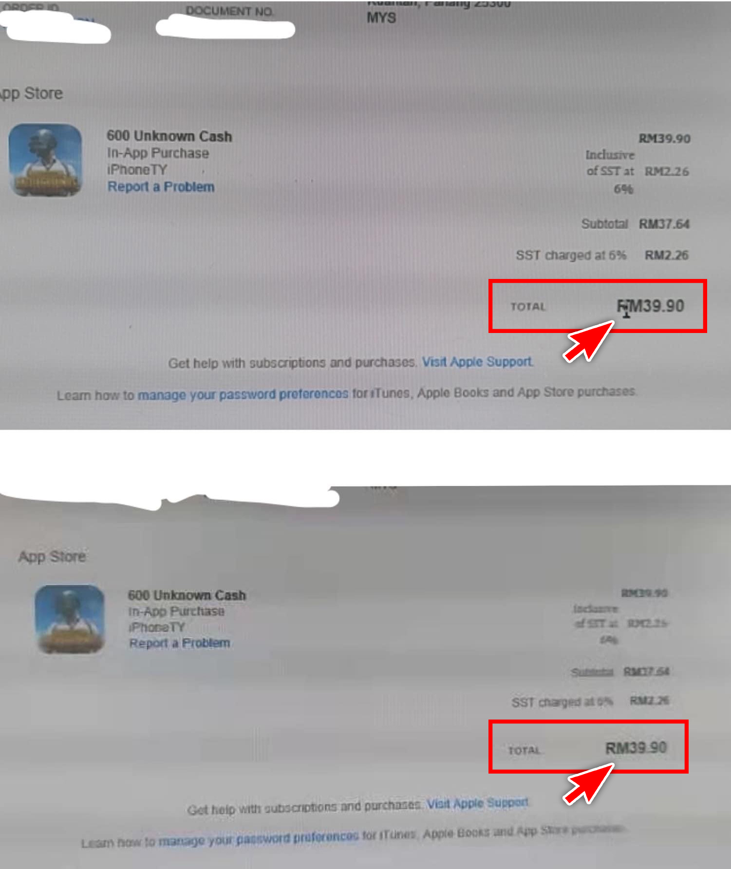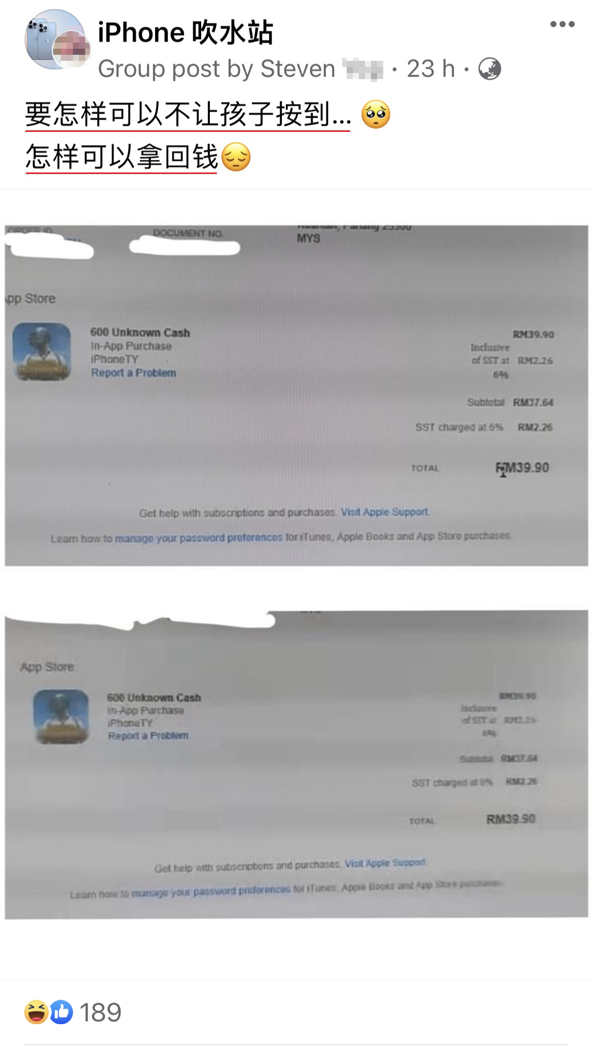 ▼ 贴主分享的照片显示,家里的小孩用他的苹果电子产品通过 App Store 刷卡买单,给《绝地求生(PUBG)》游戏 App 充值了RM39.90,而且该交易已经成功付款!