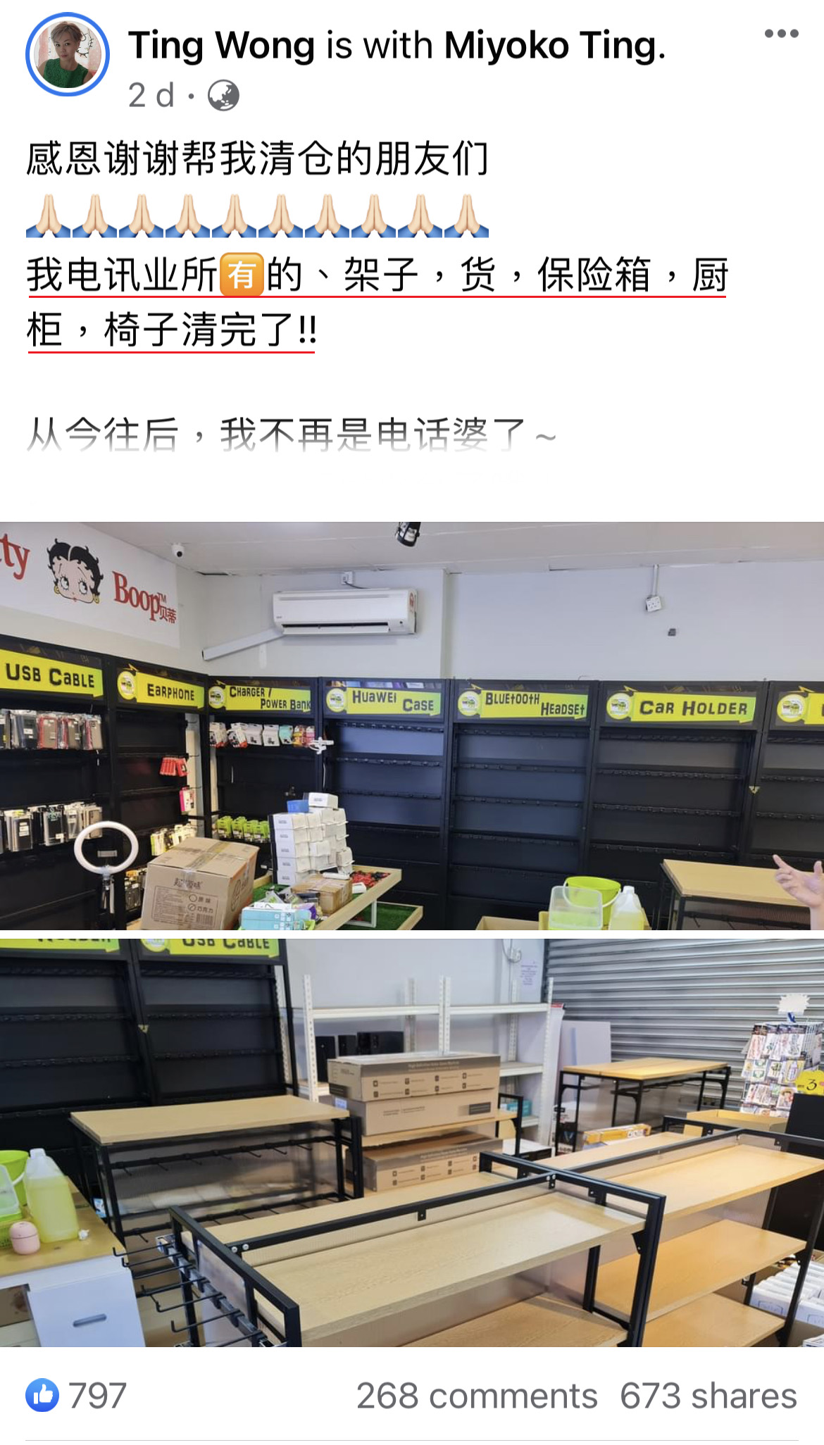 感恩谢谢帮我清仓的朋友们,我电讯业所有的架子、货、保险箱、厨柜、椅子清完了!从今往后,我不再是电话婆了,我 100% 专注在直播平台了哦!