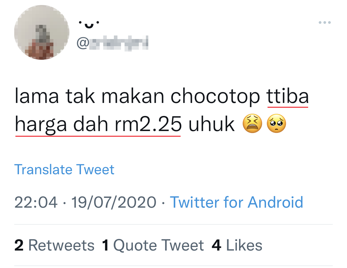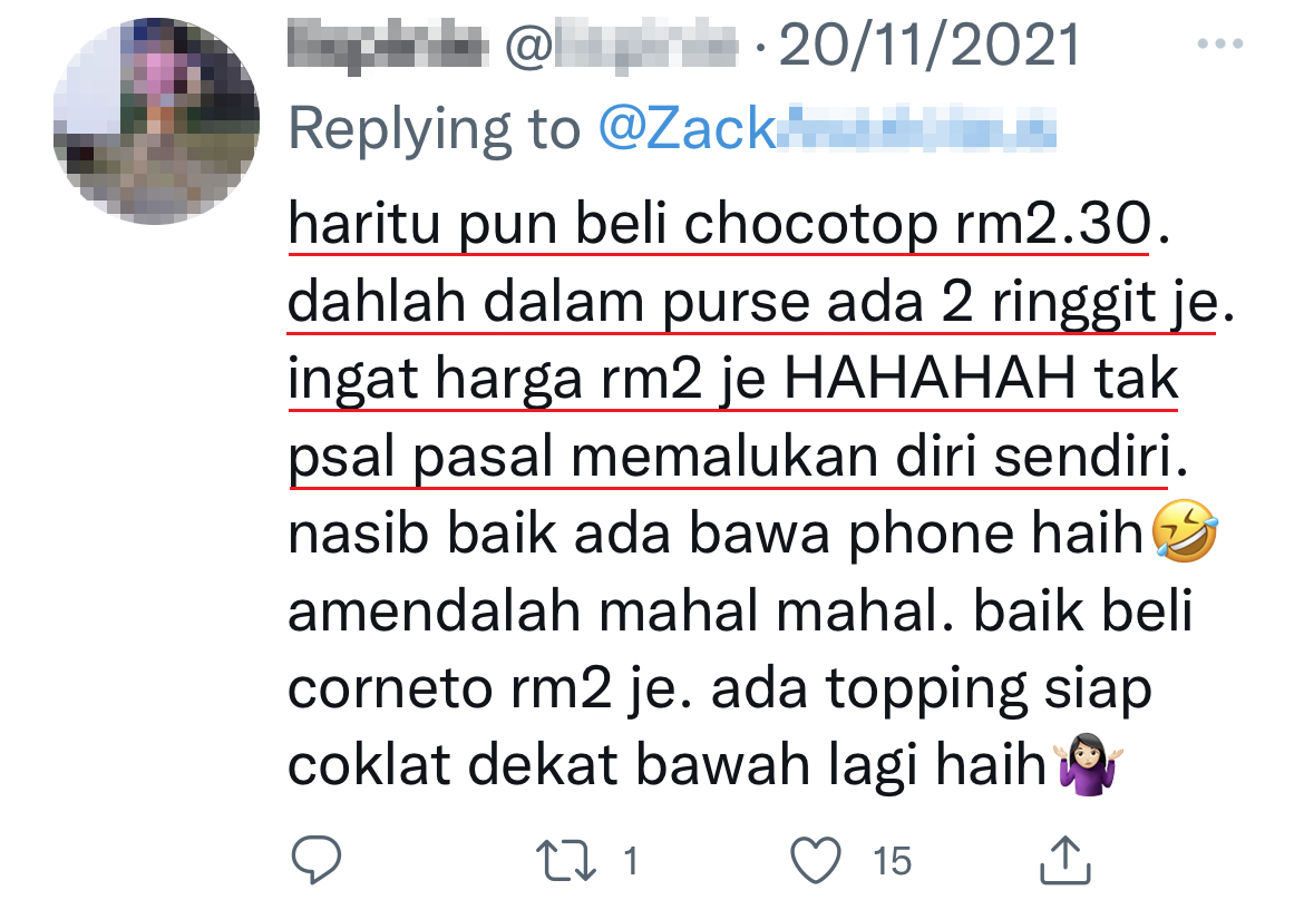 ▼「那天我的钱包只剩RM2现金,想说 ChocoTop RM2而已,就买了,怎么知道已经涨价到RM2.30了,当下好尴尬… 」