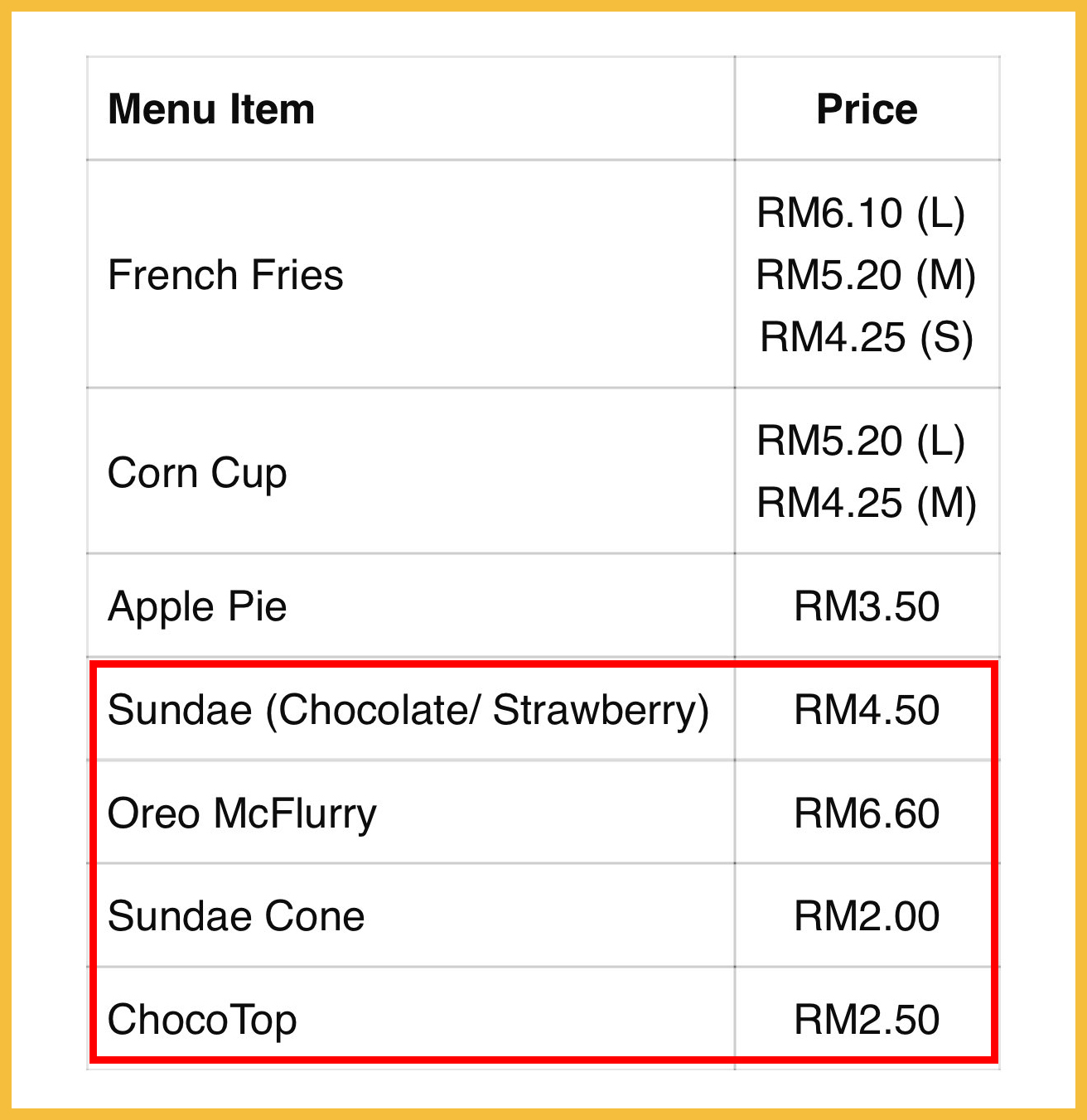 • Sundae(巧克力/草莓)最新价格:RM4.50