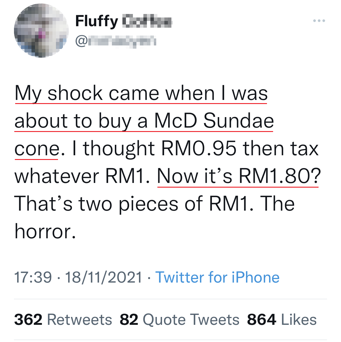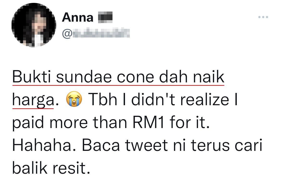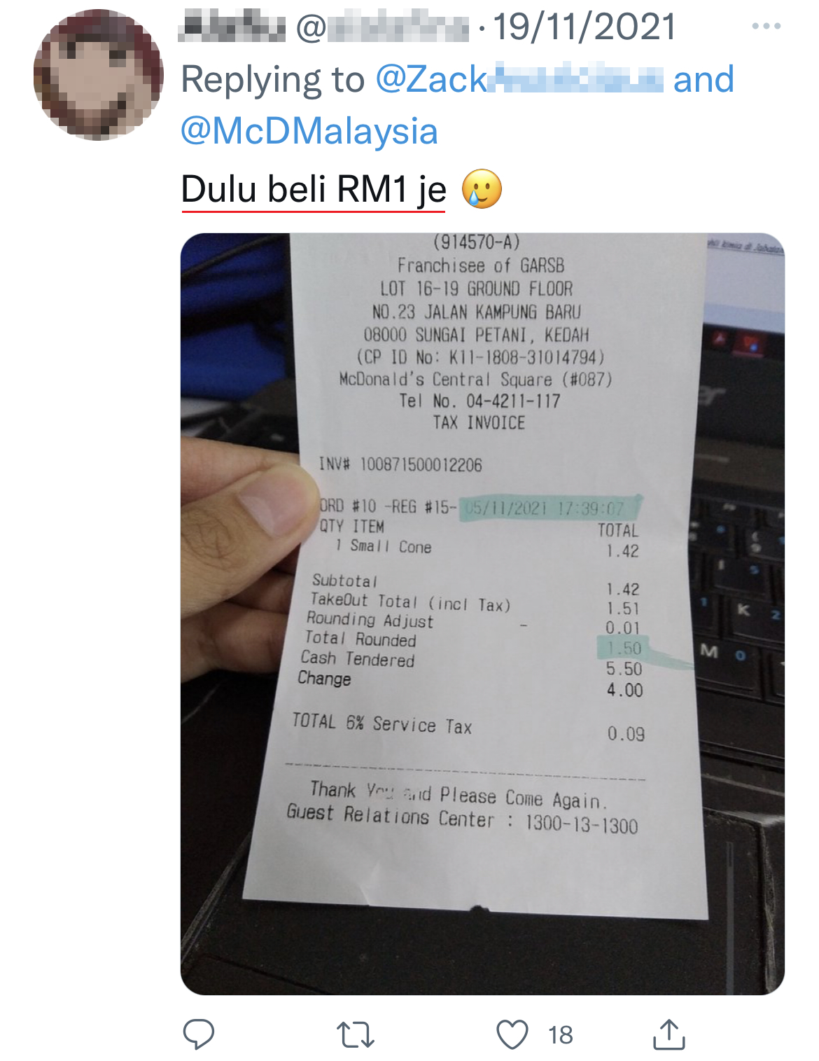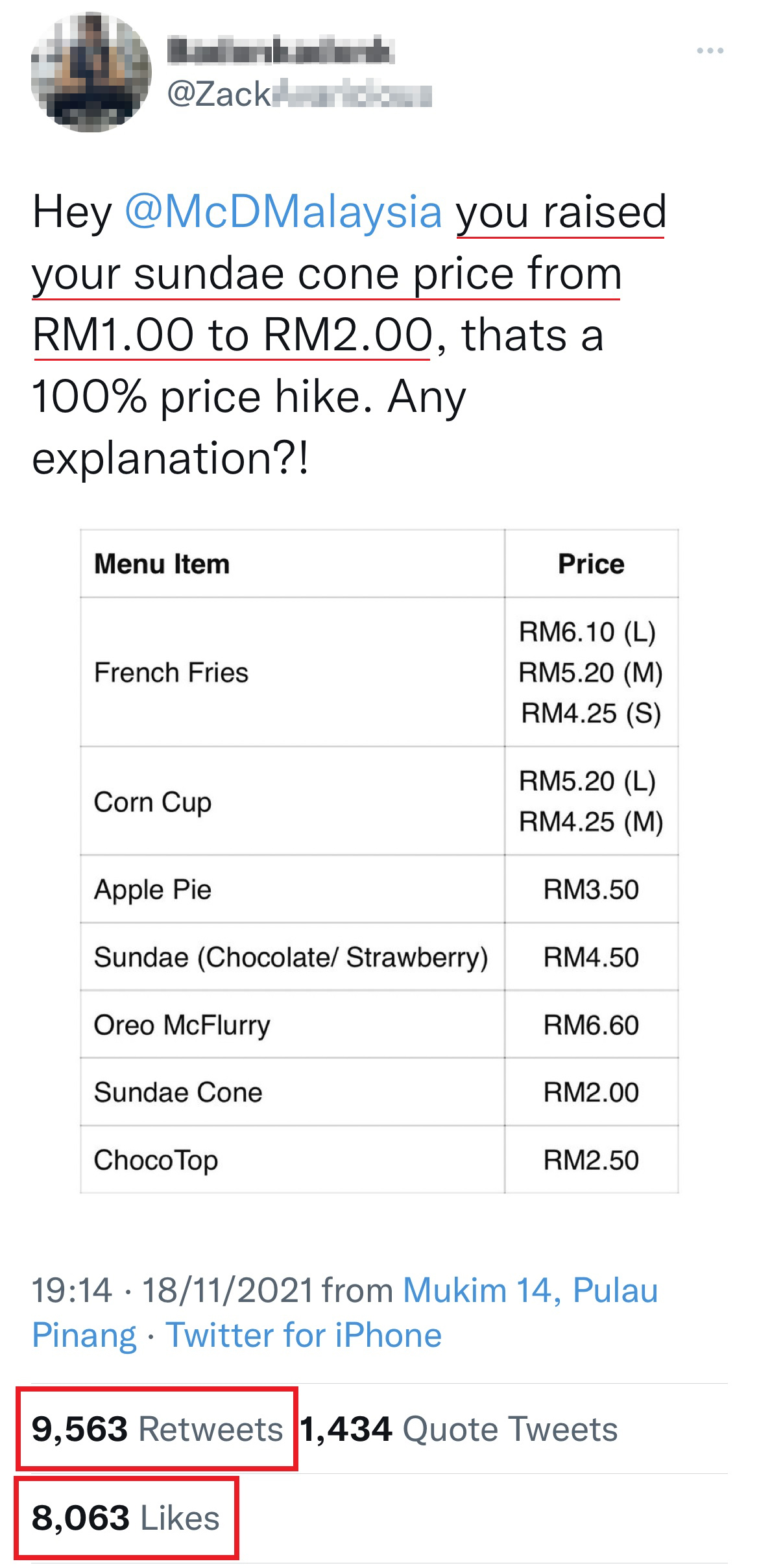 楼主在推文里 tag 大马麦当劳的官方 Twitter,并愤愤不平地写道:「你的 Sundae Cone 从RM1变RM2,涨价这么多,有何解释?」