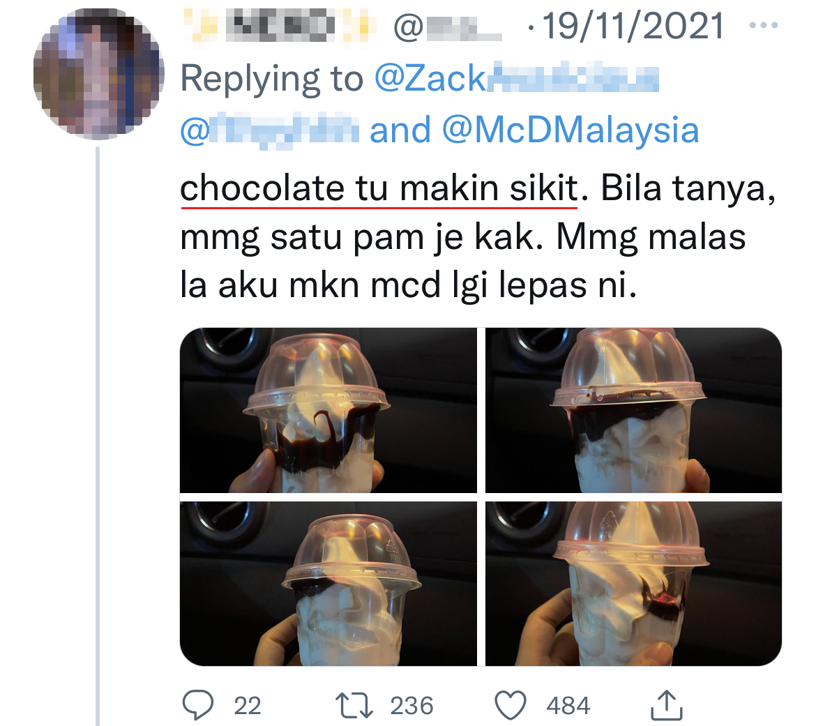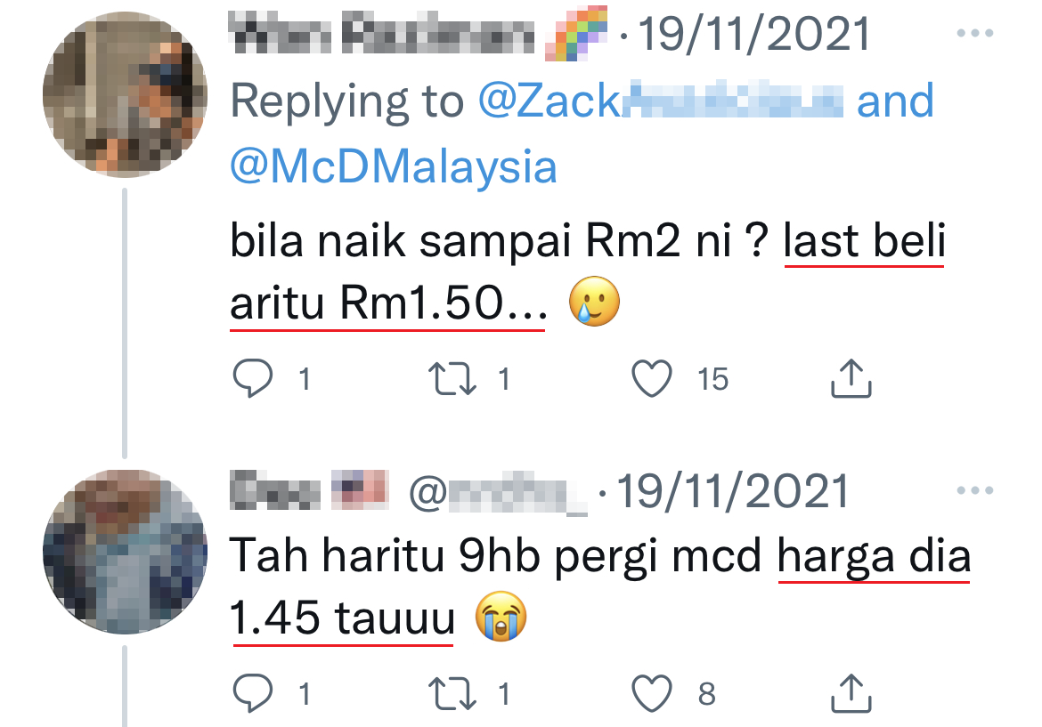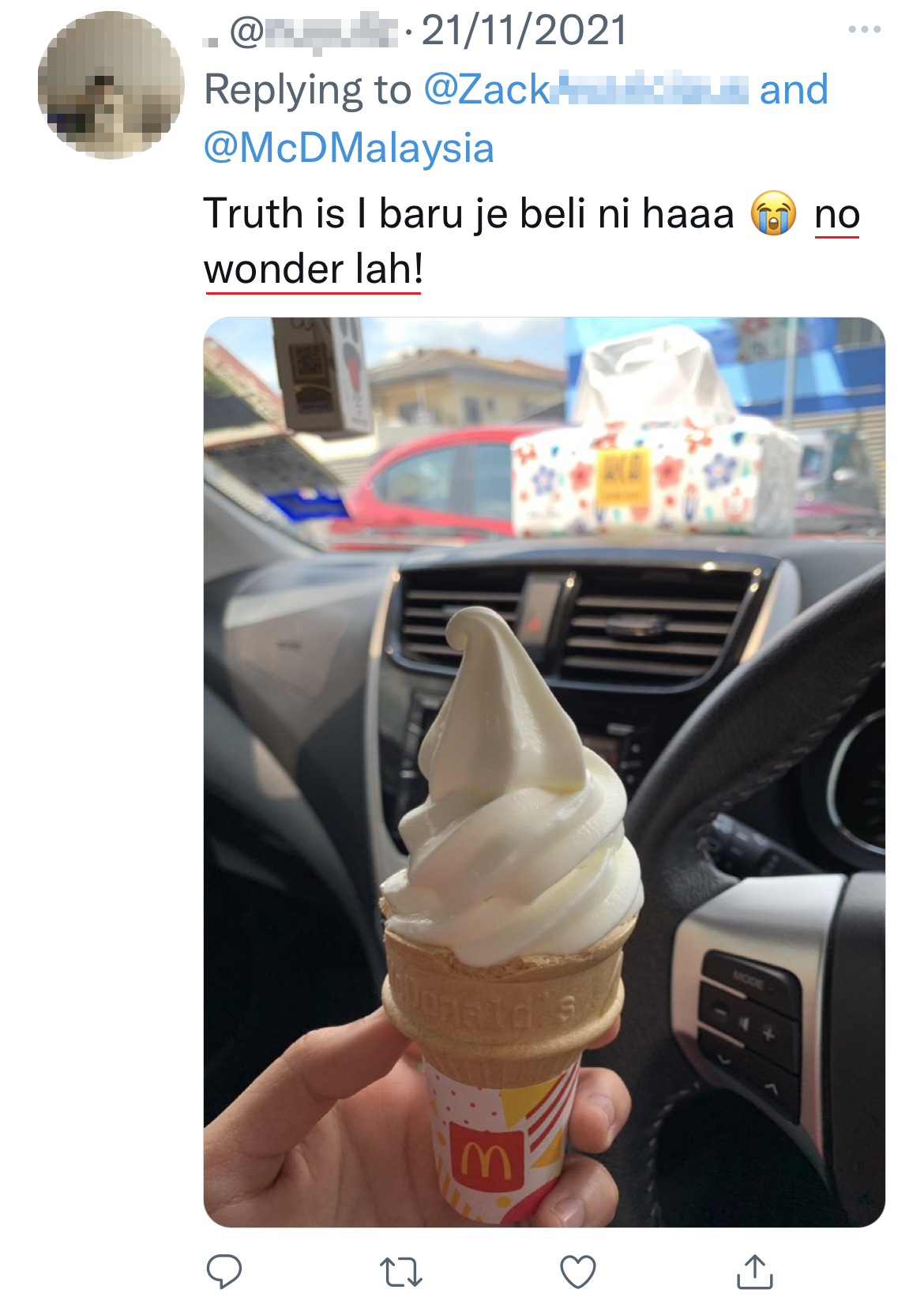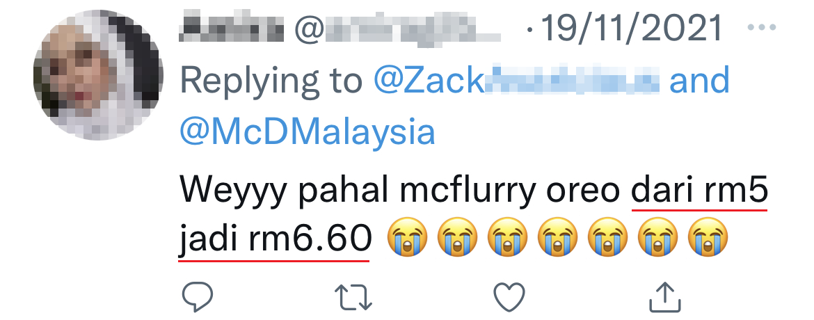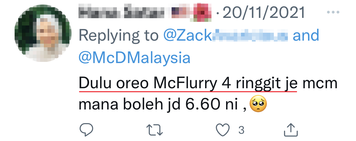 楼主在推文里 tag 大马麦当劳的官方 Twitter,并愤愤不平地写道:「你的 Sundae Cone 从RM1变RM2,涨价这么多,有何解释?」