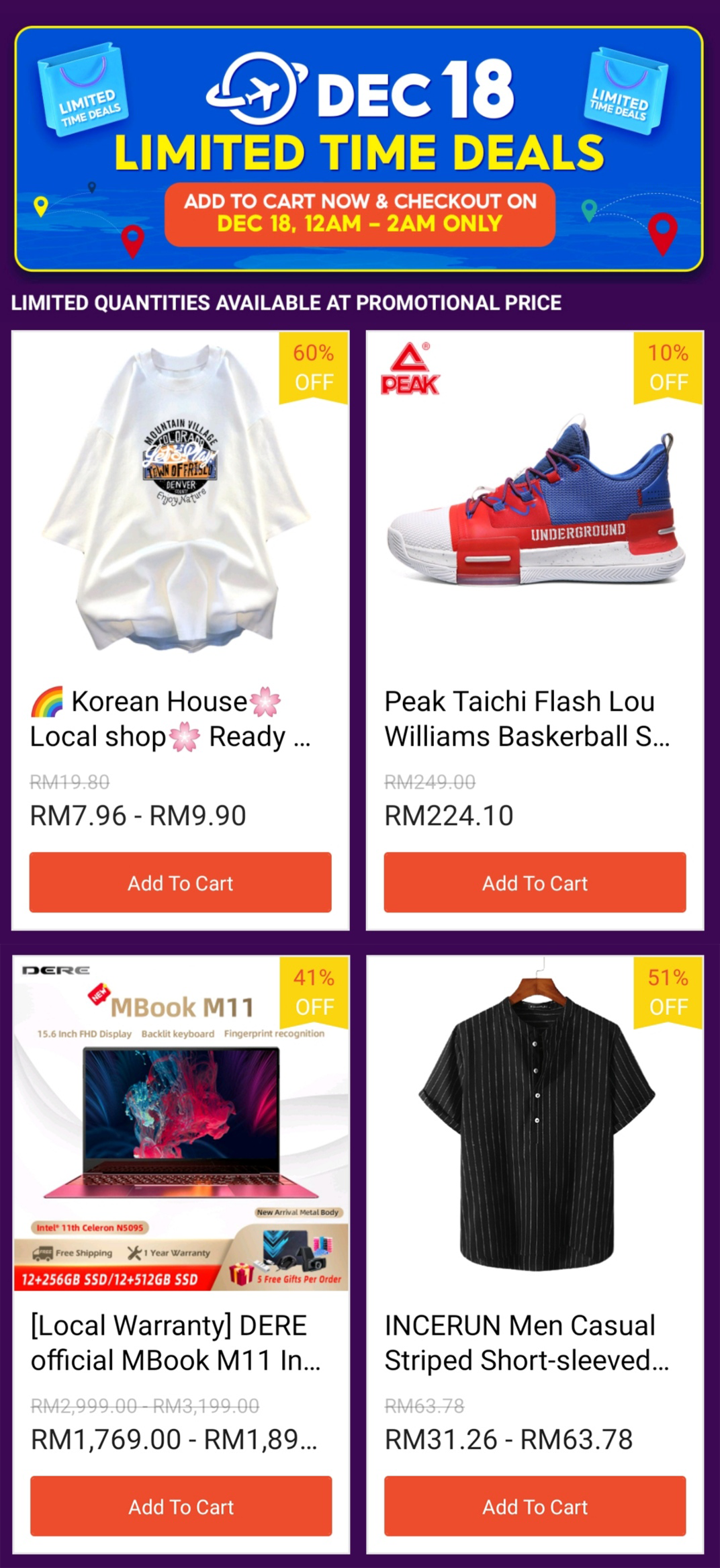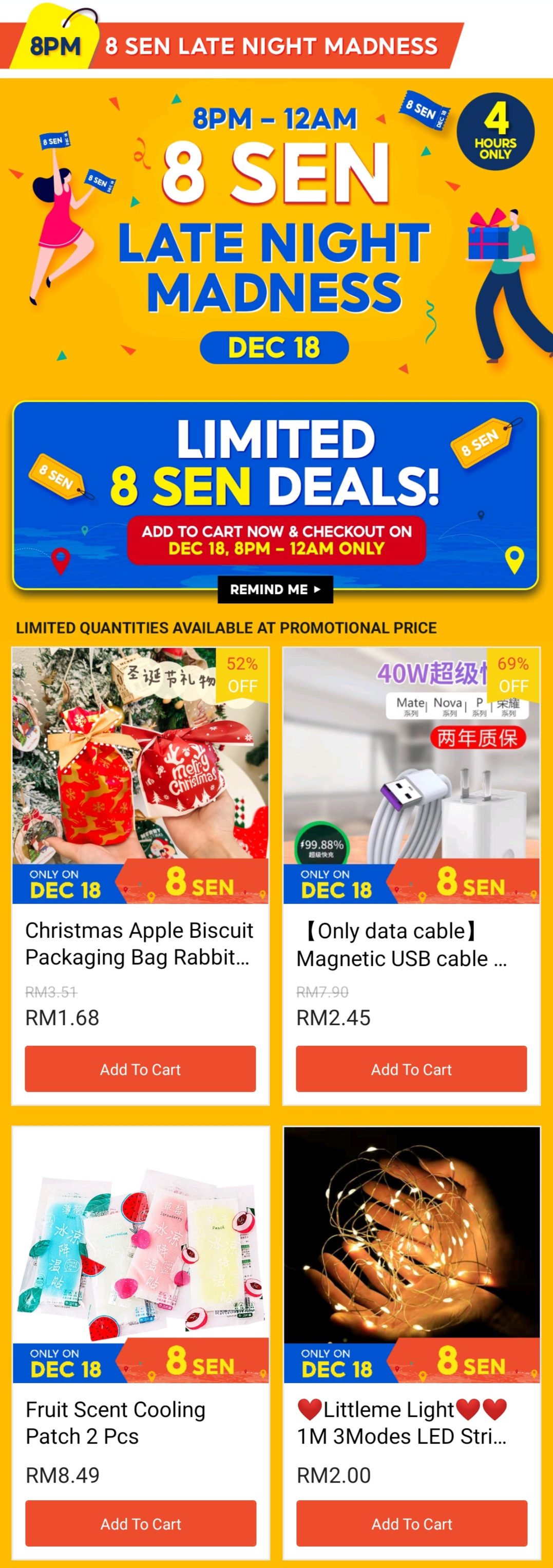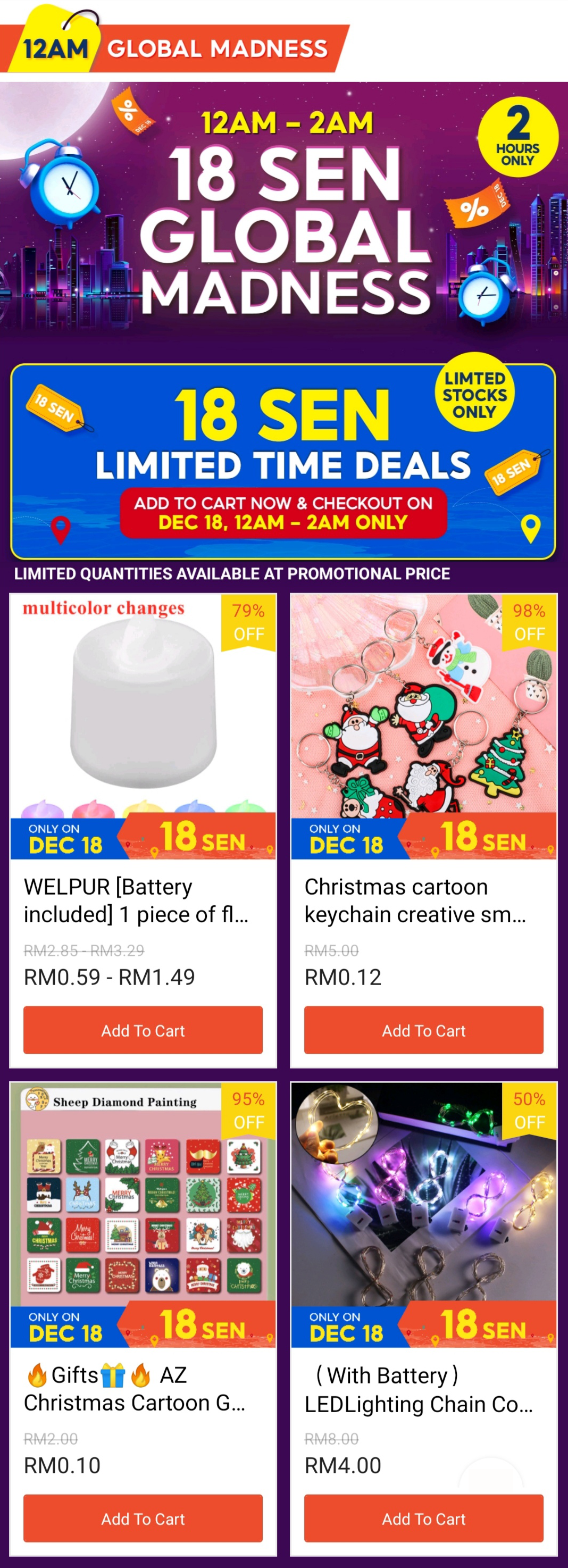 i)12月18日凌晨12am 至2am,推出2个小时RM0.18 特价优惠商品!