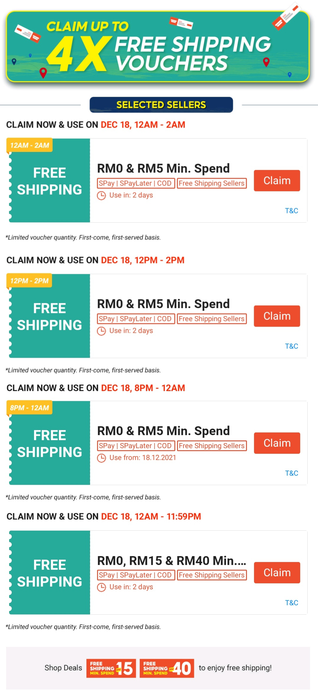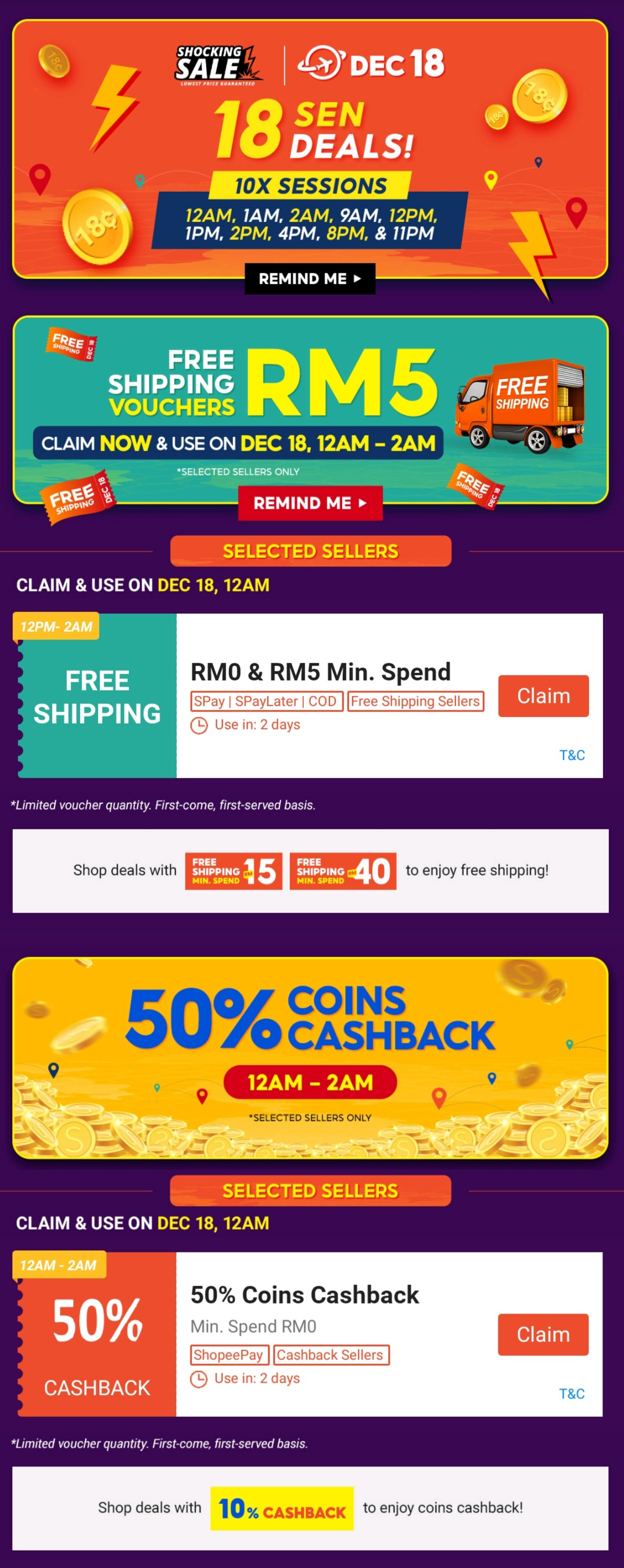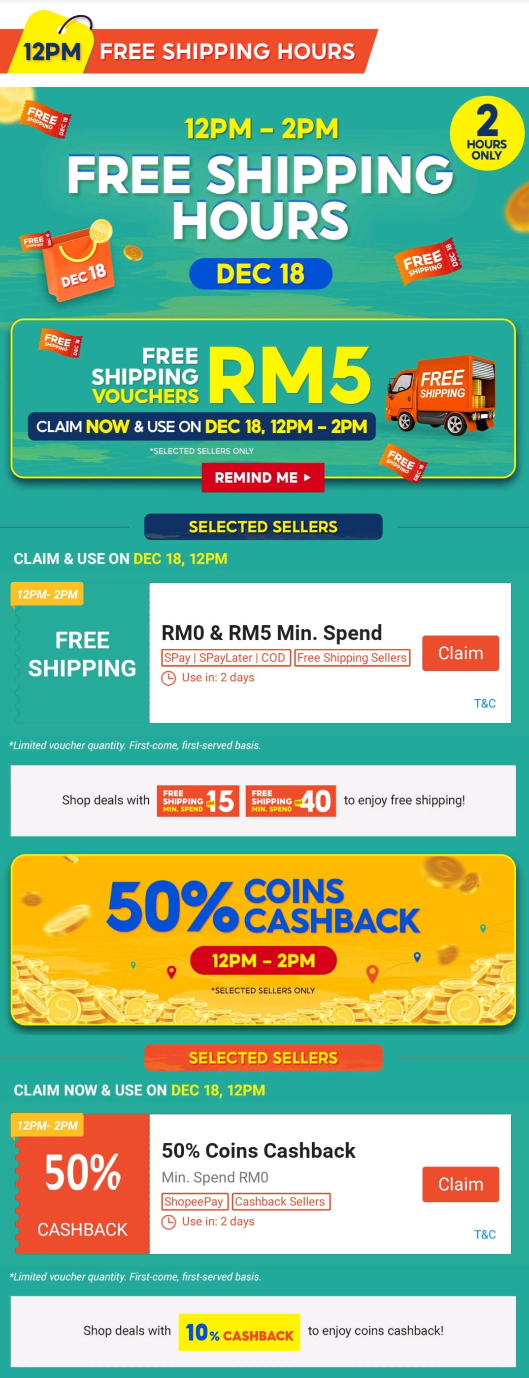 i)中午12pm 至2pm 可享有RM0 & RM5 免邮券 + 50%Shopee 币回扣券!限于指定商家!