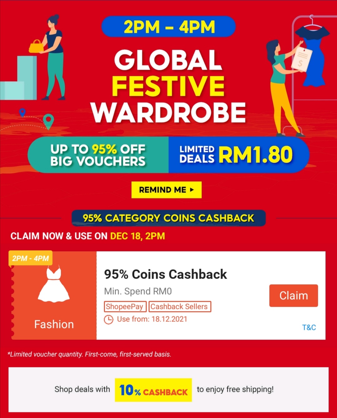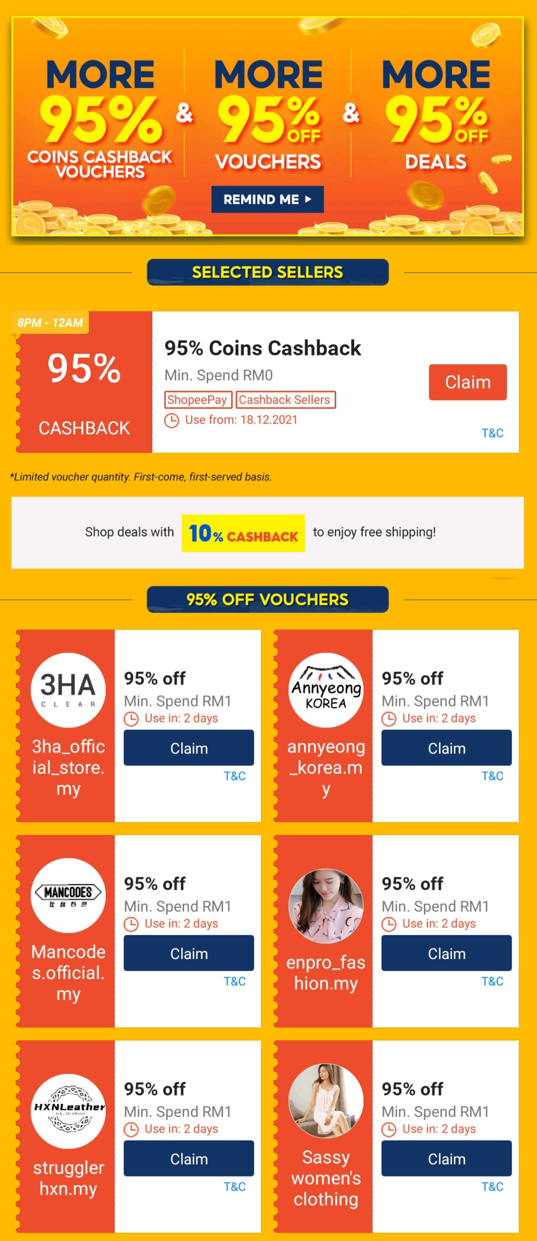 i)8am 至10pm 在这2个时段推出95%Shopee 币回扣券!以及指定电子产品、服装等折扣券给大家!
