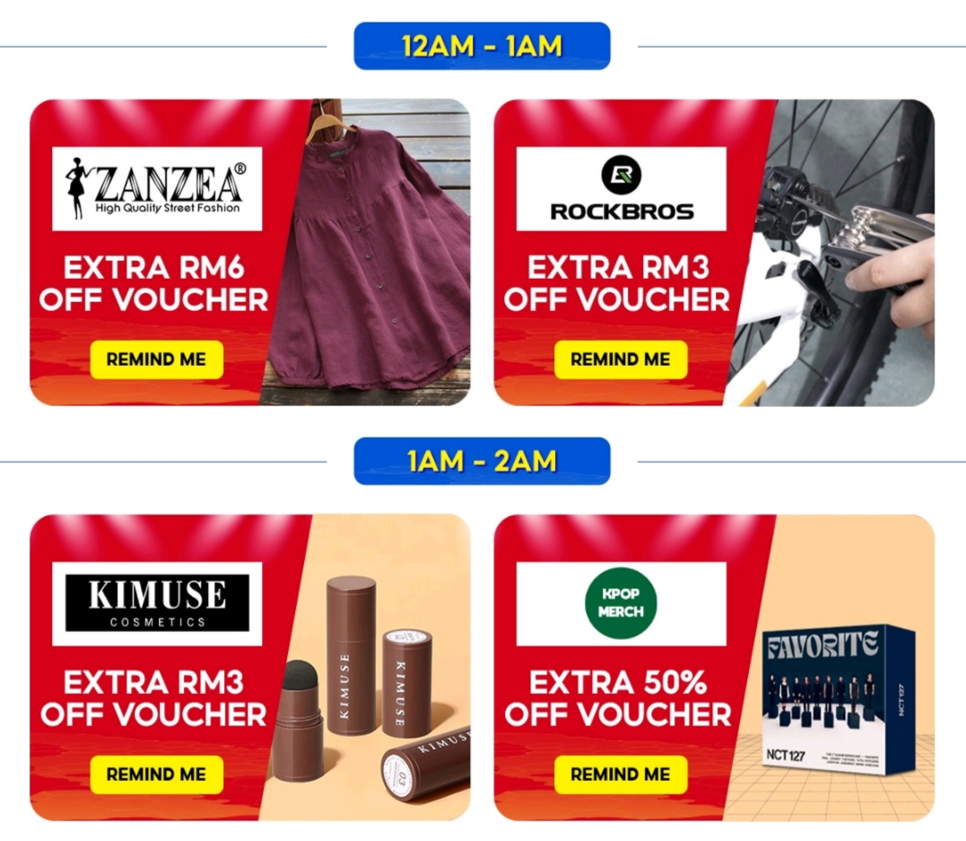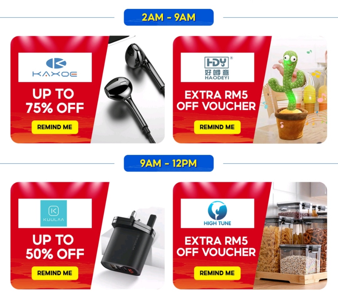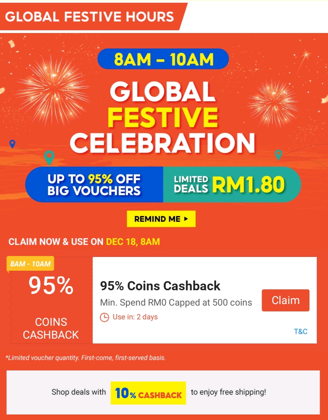ii)在这2个小时限时优惠内,可领取最低RM0 & RM5 免邮券 + 50%币回扣券!