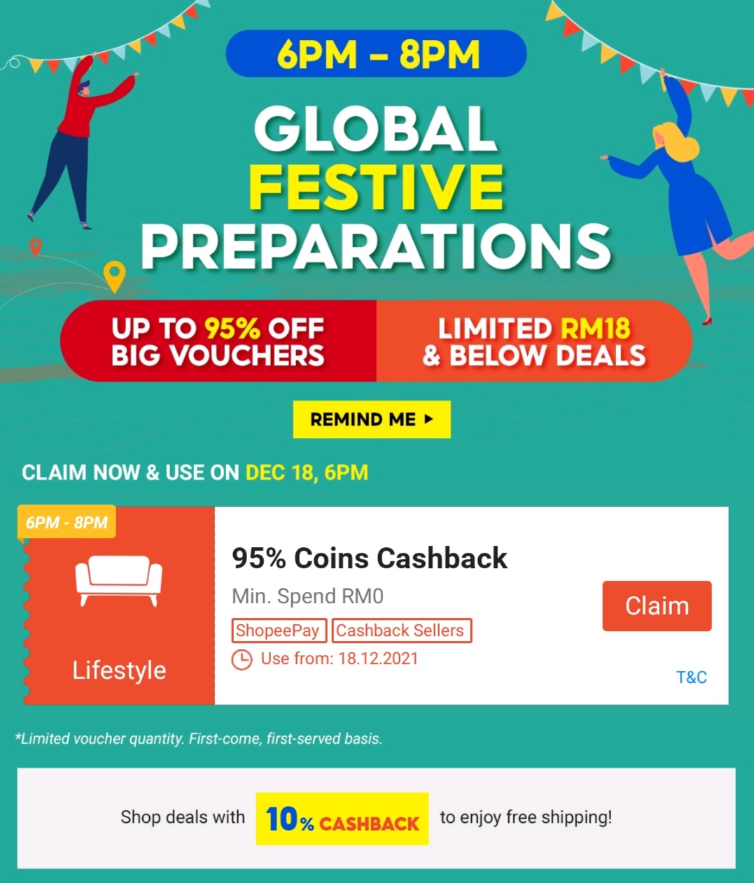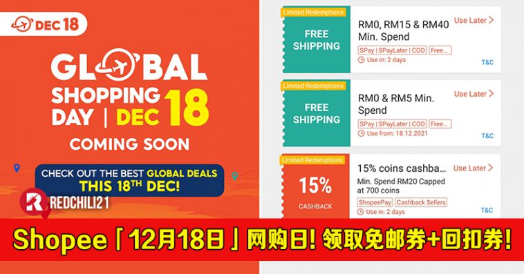 Shopee 将在12月18日举办【Global Shopping Day】全球购物促销日!Shopee 用户可在12月18日当天享有最低RM0 免邮券、95%现金回扣券,以及享有最低RM0.18 促销商品!