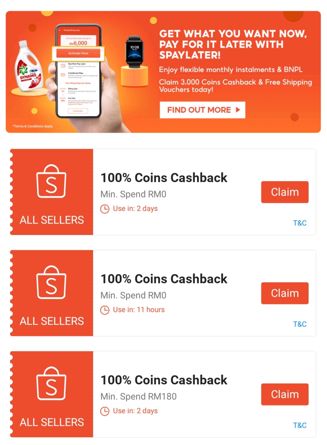 ii)开通SPAYLATER 用户可领取以下3张100% Shopee 币回扣券!