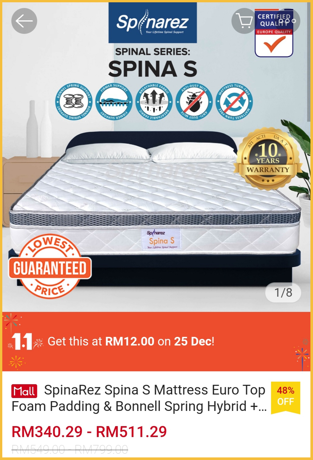 SpinaRez Spina S Tilam Mattress Euro Top Foam Padding & Bonnell Spring Hybrid + Coconut Fiber (10″) QueenRM389 RM12