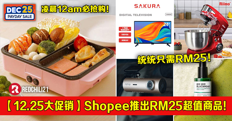 Shopee 【12.25】发薪日大促销即将来临了,在这天除了有推出RM25 超值商品之外,还推出家具用品限时优惠,最低RM1.10起!