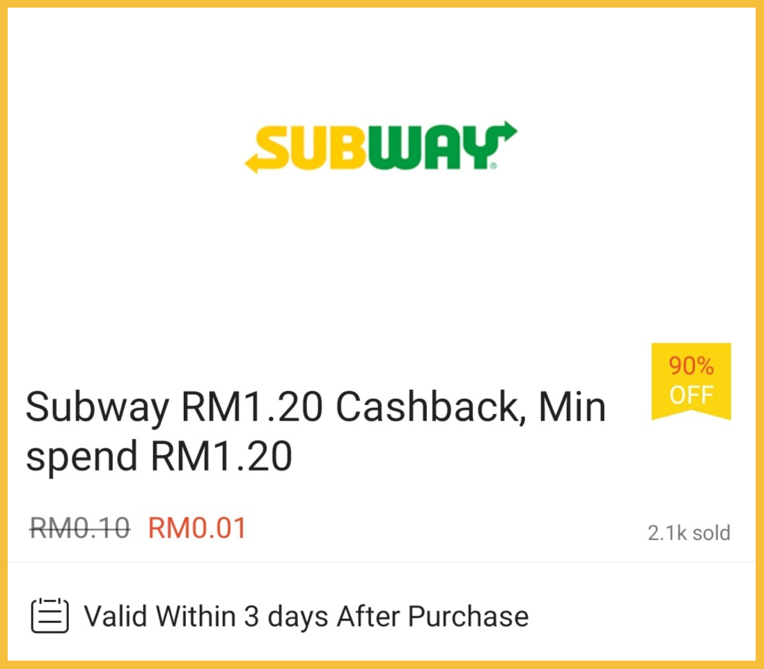 ▼ 只要你在Shopee App 购买Subway 礼券,可享有RM1.20 现金回扣!也就说使用这张礼券来付款,就可获得RM1.20 回扣,一盒6片曲奇饼只需RM7.60(需使用ShopeePay付款)