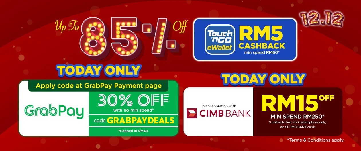 - 使用Grabpay 电子钱包付款 – 可享有30%回扣(仅限12月12日 | 需输入优惠代码【GRABPAYDEALS】)