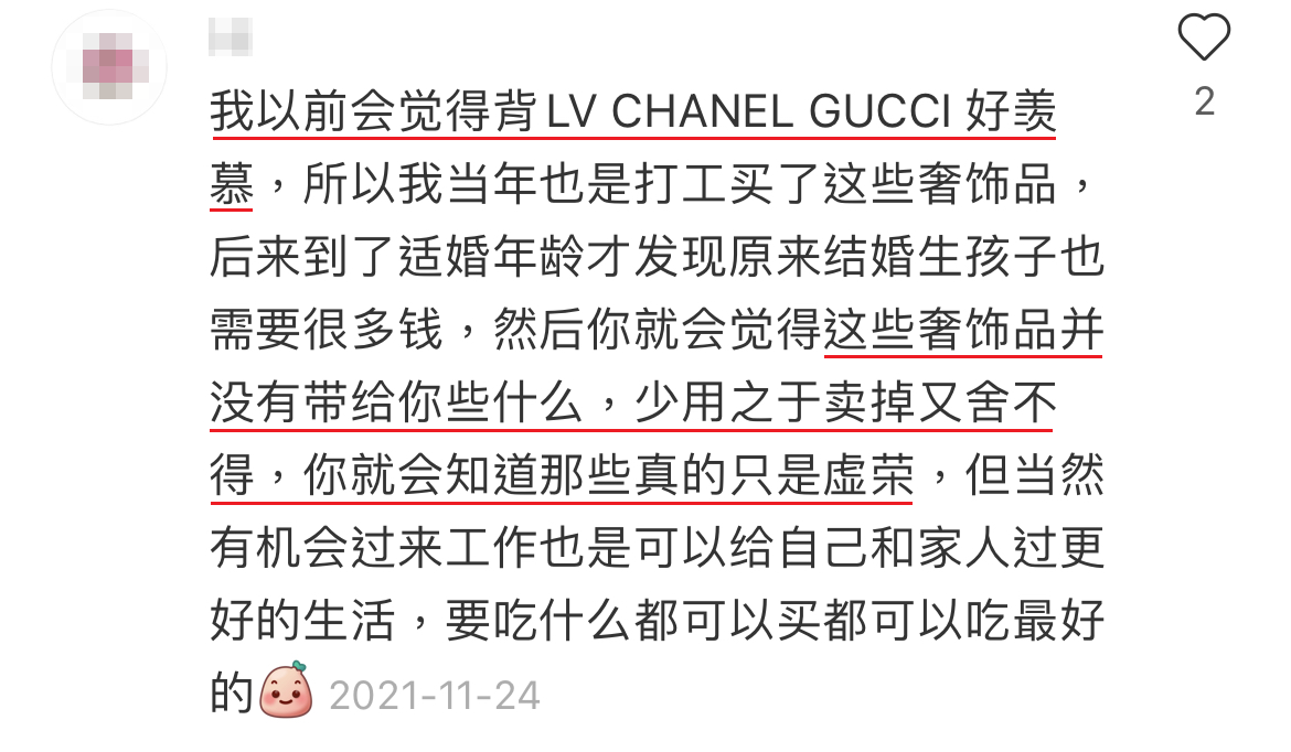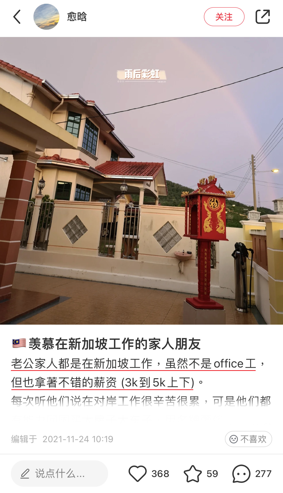 每次听他们说在对岸工作很辛苦很累,可是他们都有能力回国买大房子、大车子、用名牌奢侈品,所以我还是很羡慕的。