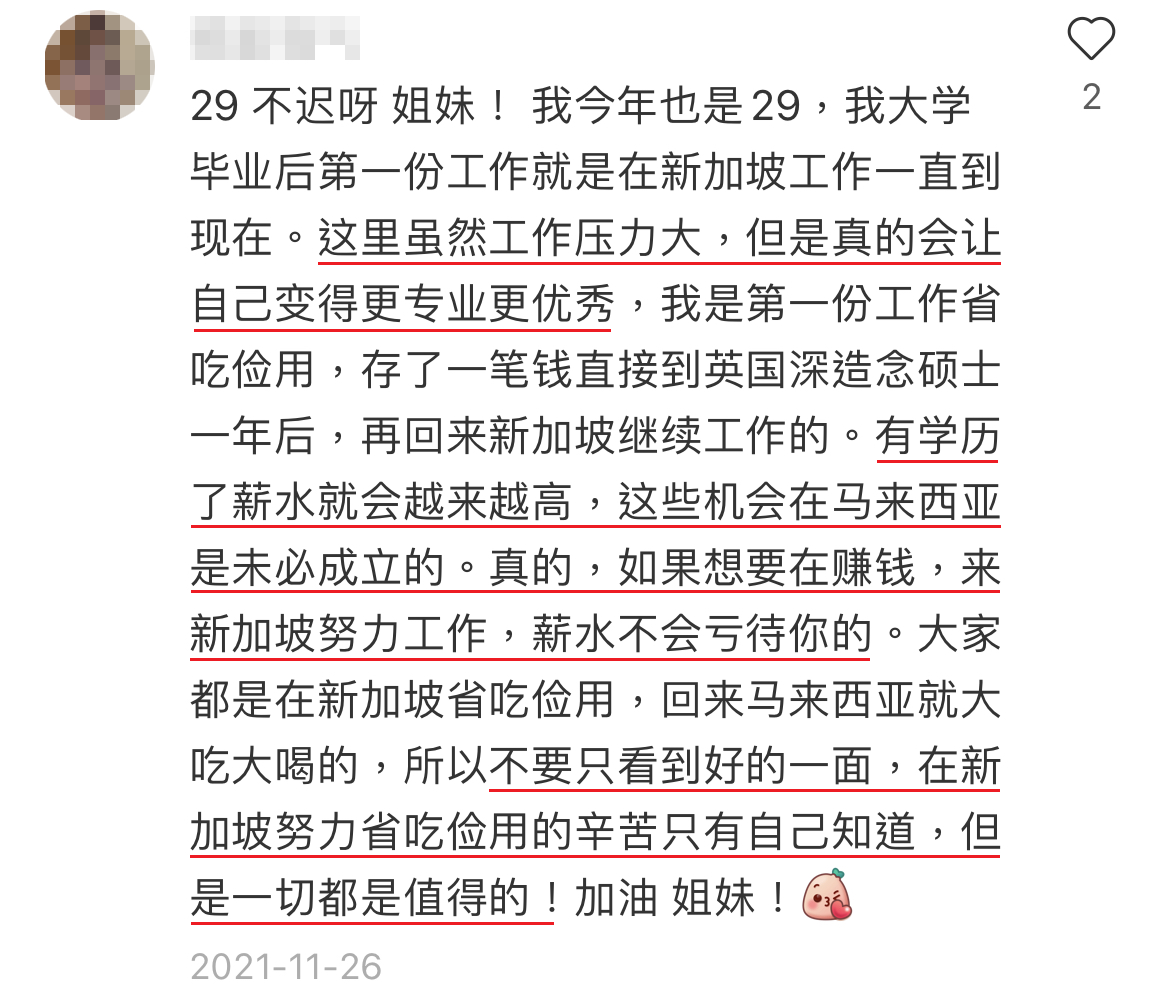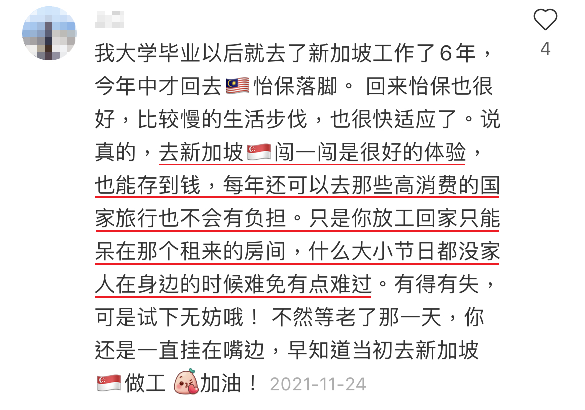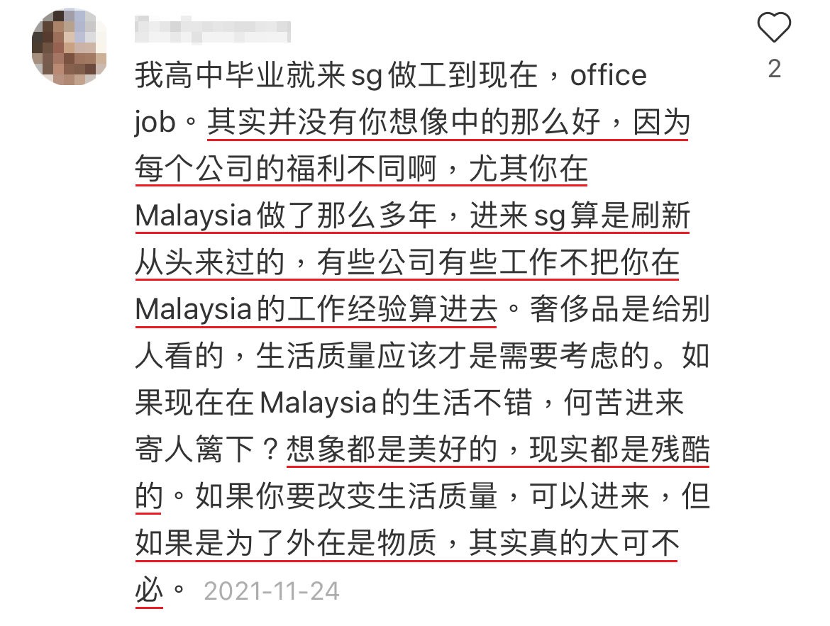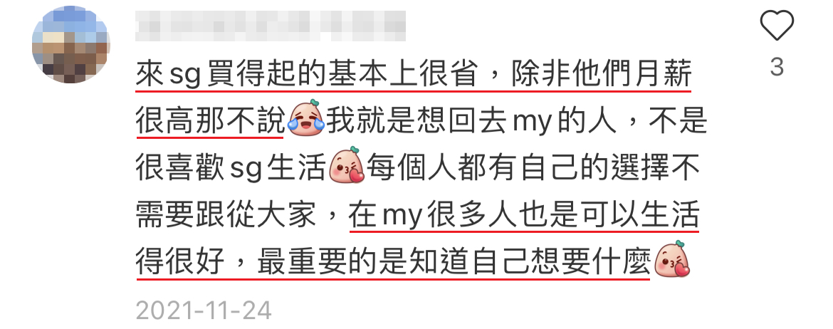 近期在找着新加坡的工作,开始很多声音说:「你去了那里会很累很辛苦,要和家人分开,不久后你就会想回来了。但当你想回来时,你就发现回不来了,因为这里的薪资无法负荷你的生活费。」