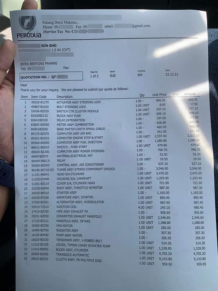 ▼ 经过水灾以后车子受到严重损伤,该名 Perodua Myvi 车主将自己的爱车送去 Perodua 原厂进行维修。照片中的账单列出了多达47项维修项目,整辆车从内到外大大小小的维修费用。一点一点一点地修,同时荷包就一点一点地在输出……