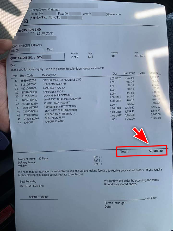 ▼ 最后结算的总费用:RM59,105.20!(这不是买车,是修车哦!)