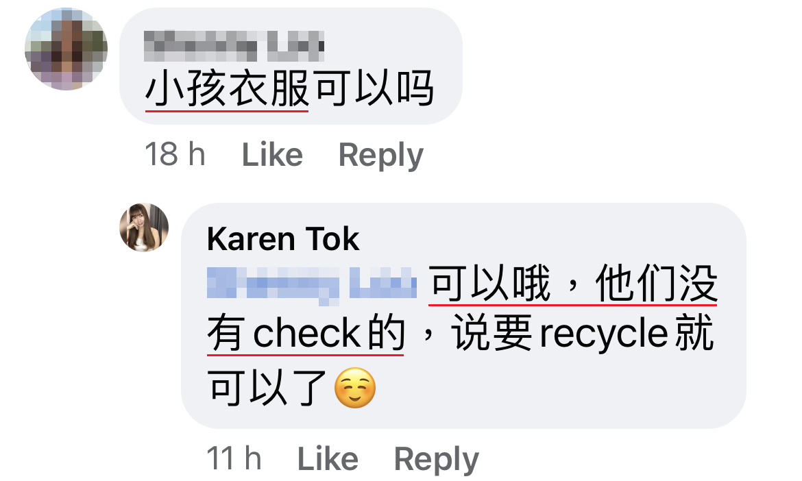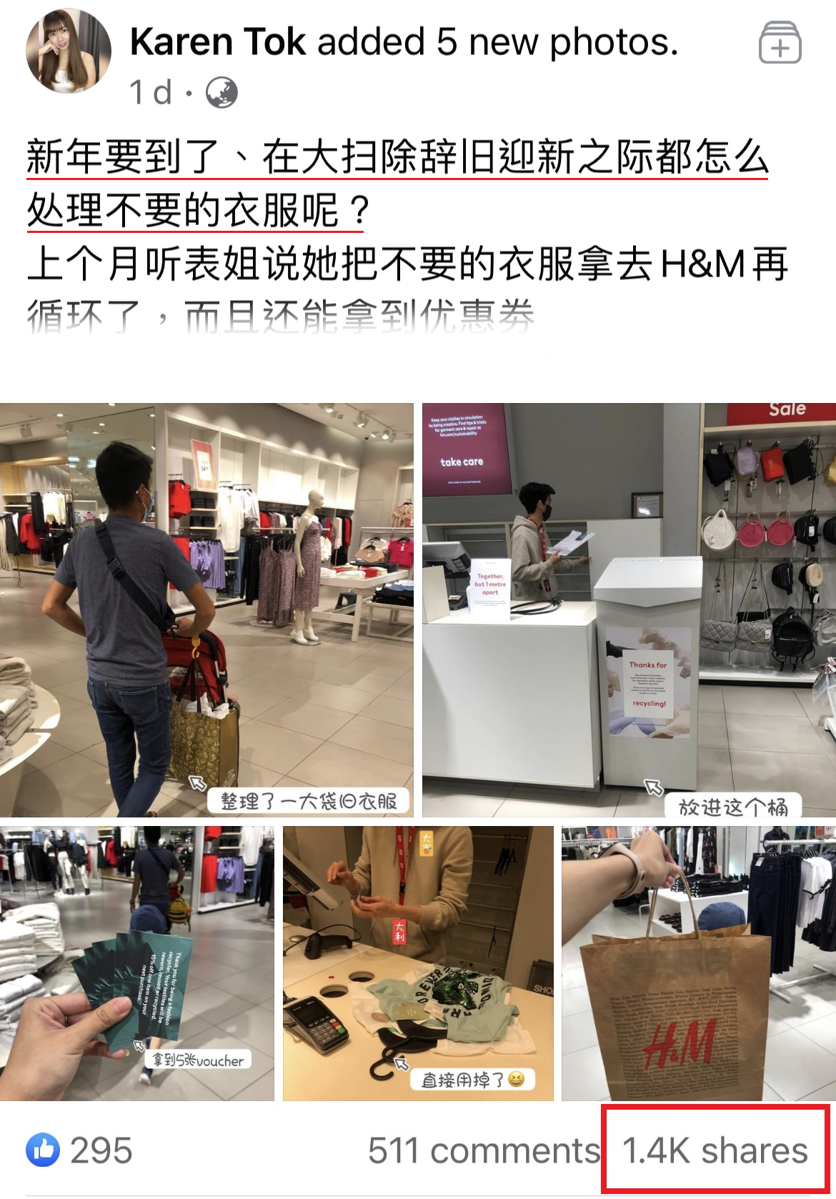 一名大马年轻妈咪近日在脸书分享,拿着一袋一袋不要的衣服去 H&M 回收,免费获得几张折扣优惠券,现场就立刻买起来了!