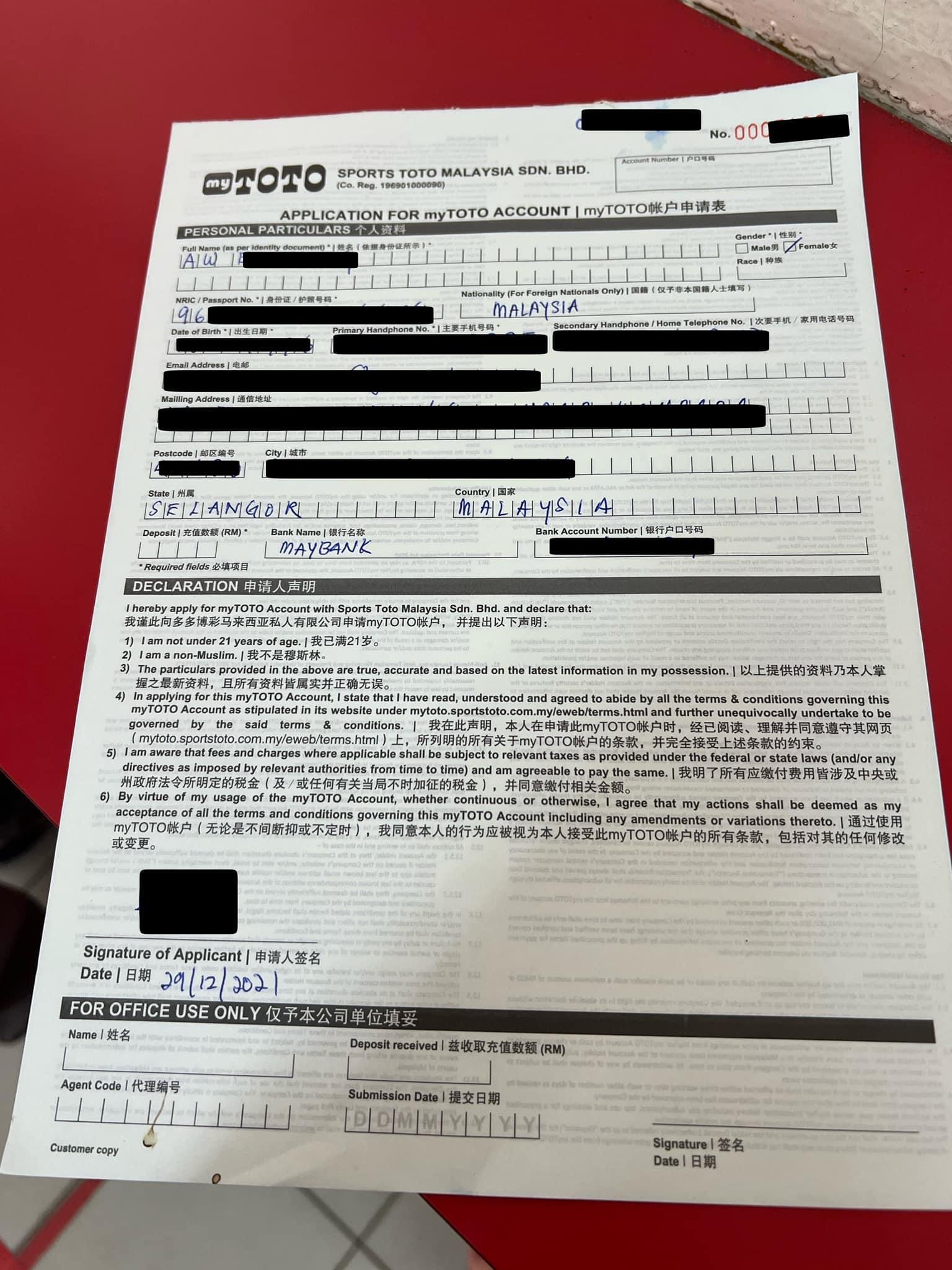 ▼ Step 1:首先,可以到邻近的 Sports Toto 告诉店员你要申请 MyToto app 的户口。他会给你一个 form 让你填,然后会拍你的 IC upload。过后会问你要 top-up 多少钱,RM20就可以了,以后都是自己在 app 里面 top-up 了喔~