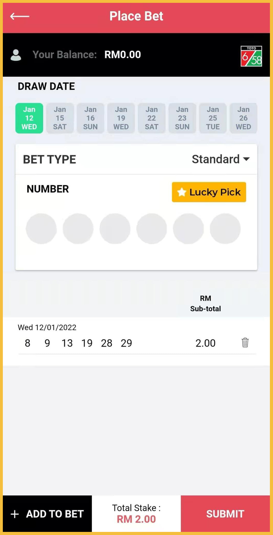 Supreme 6/58 也很容易喔,只要在号码点点点,六个就可以了,要选择 lucky pick 也可以。