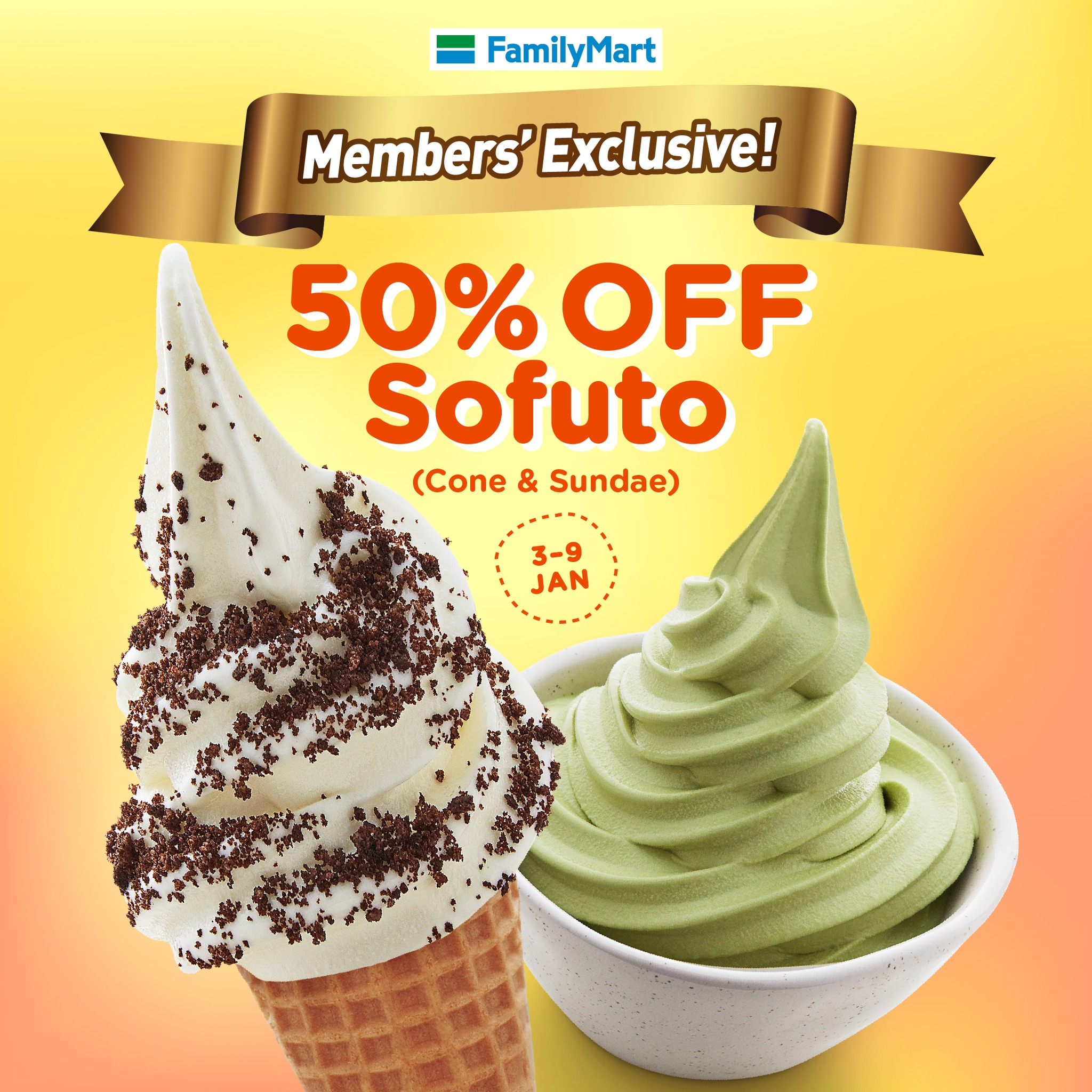 从即日起至1月9日,FamilyMart 推出Sofuto Cone 和 Sundae Cup 折扣50%!只要你是MY FamilyMart 会员就可享有此优惠!